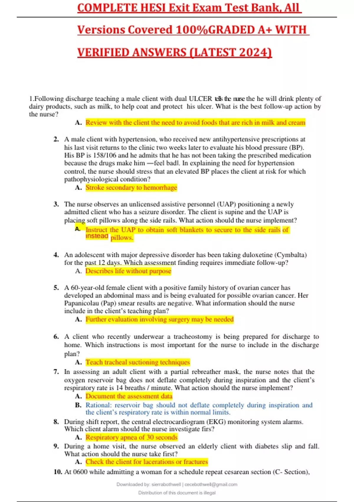 HESI Exit Exam Test Bank, All Versions Covered 100%GRADED A+ WITH VERIFIED ANSWERS (LATEST 2024)