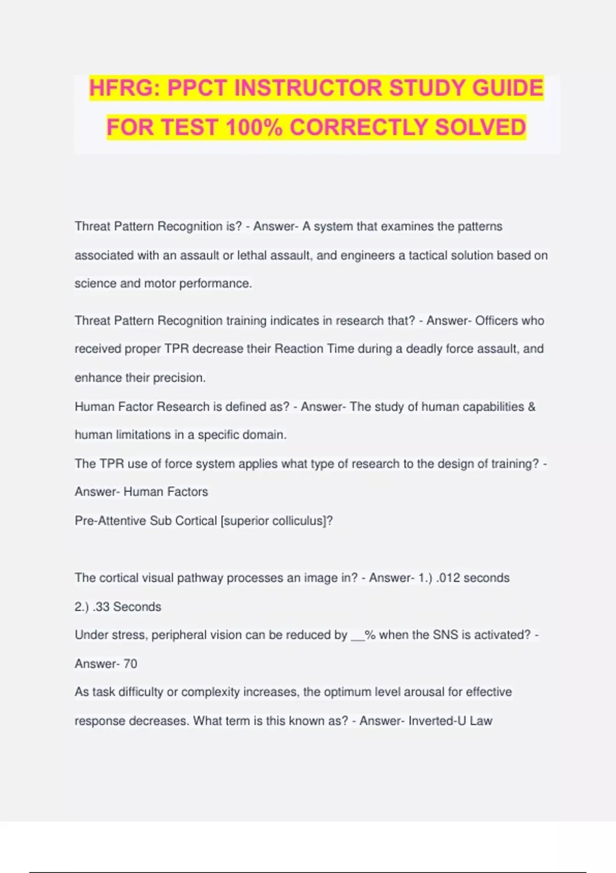 HFRG: PPCT INSTRUCTOR STUDY GUIDE FOR TEST 100% CORRECTLY SOLVED Threat Pattern Recognition is? - Answer- A system that examines the patterns associated with an assault or lethal assault, and engineers a tactical solution based on science and motor performance. Threat Pattern Recognition training indicates in research that? - Answer- Officers who received proper TPR decrease their Reaction Time during a deadly force assault, and enhance their precision. Human Factor Research is defined as? - Answer- The study of human capabilities & human limitations in a specific domain. The TPR use of force system applies what type of research to the design of training? - Answer- Human Factors Pre-Attentive Sub Cortical [superior colliculus]? The cortical visual pathway processes an image in? - Answer- 1.) .012 seconds 2.) .33 Seconds Under stress, peripheral vision can be reduced by __% when the SNS is activated? - Answer- 70 As task difficulty or complexity increases, the optimum level arousal for effective response decreases. What term is this known as? - Answer- Inverted-U Law Human Factors is? - Answer- the study of human capabilities and human limitations in a specific domain. High-Risk Human Factors is defined as? - Answer- The study of human capabilities and limitations in a high risk environment that is dynamic (chaotic), fluid (uncertain), time compressed and life threatening. Officers feloniously killed with firearm: Distance - Answer- 0-5 Feet: 51.9% 6-10 Feet: 19.2% 0-10 Feet: 71.1% In Siddle's follow-up to Hontz's study regarding assailant response time, he found? - Answer- Assailant movement speed was .37 seconds. Siddle also found officer response time from the holster was 1.9 seconds without aiming, 2.4 seconds when aiming. The four components of Acceptability? - Answer- 1.)Tactical 2.)Legal 3.)Medical 4.) Human Factors Research Mental States in Combat - Answer- 1.) Combat Anxiety 2.) Survival Stress 3.) Combat Stress "The anticipation of danger", this application may lead to a gradual deterioration of both mental and physical skills. - Answer- Combat Anxiety "Deadly force threat perception that initiates the SNS discharge," the associated physiological changes can affect performance. - Answer- Survival Stress