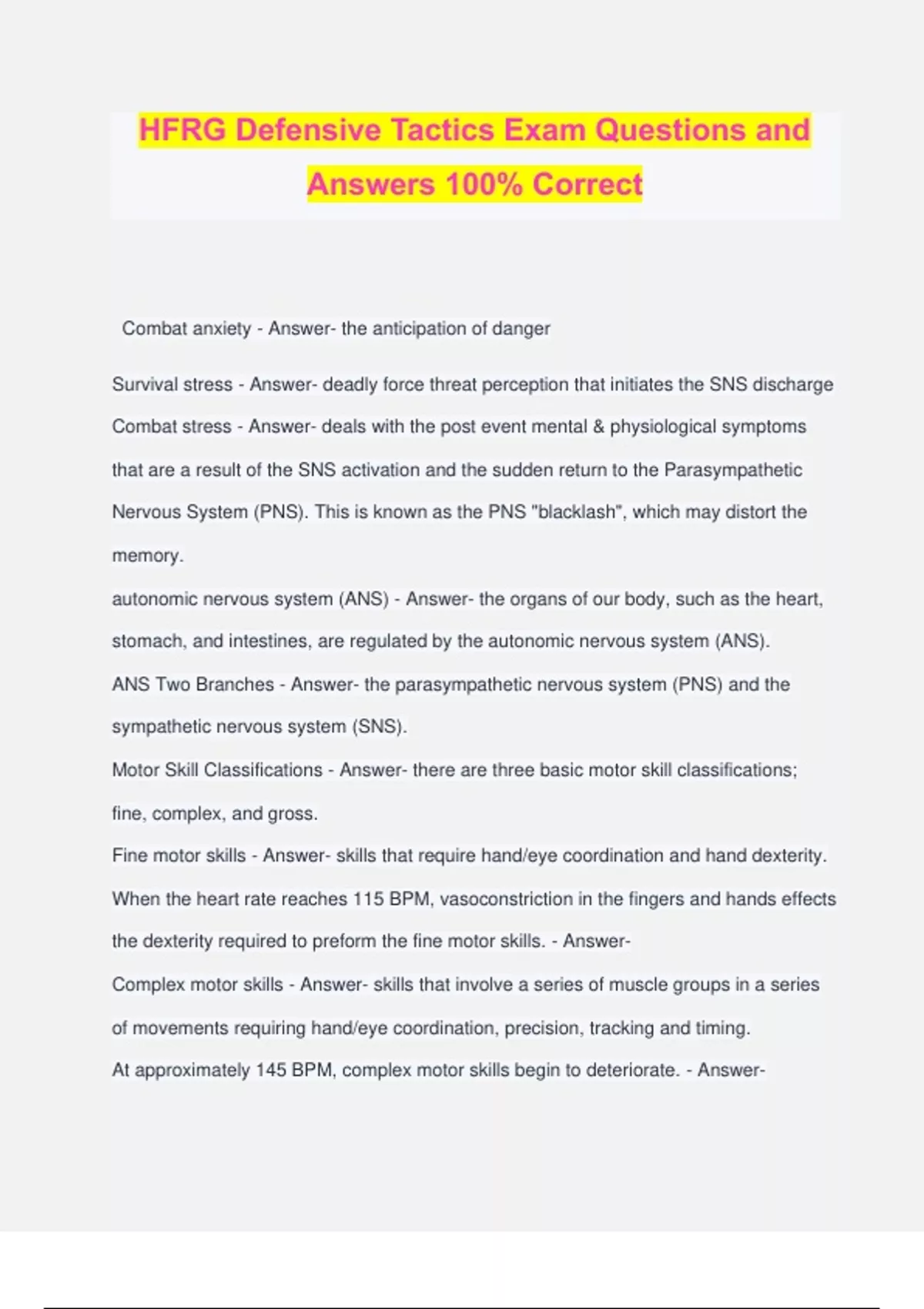 HFRG Defensive Tactics Exam Questions and Answers 100% Correct Combat anxiety - Answer- the anticipation of danger Survival stress - Answer- deadly force threat perception that initiates the SNS discharge Combat stress - Answer- deals with the post event mental & physiological symptoms that are a result of the SNS activation and the sudden return to the Parasympathetic Nervous System (PNS). This is known as the PNS "blacklash", which may distort the memory. autonomic nervous system (ANS) - Answer- the organs of our body, such as the heart, stomach, and intestines, are regulated by the autonomic nervous system (ANS). ANS Two Branches - Answer- the parasympathetic nervous system (PNS) and the sympathetic nervous system (SNS). Motor Skill Classifications - Answer- there are three basic motor skill classifications; fine, complex, and gross. Fine motor skills - Answer- skills that require hand/eye coordination and hand dexterity. When the heart rate reaches 115 BPM, vasoconstriction in the fingers and hands effects the dexterity required to preform the fine motor skills. - Answer- Complex motor skills - Answer- skills that involve a series of muscle groups in a series of movements requiring hand/eye coordination, precision, tracking and timing. At approximately 145 BPM, complex motor skills begin to deteriorate. - Answer- Gross motor skills - Answer- skills that involve large muscle or major muscle groups. Examples of a gross motor skill include simple actions such as a straight punch, a forward baton strike, or the isosceles shooting stance. What BPM range is for optimal survival and combat performance? - Answer- Between 115 and 145 BPM The Inverted U Law - Answer- Performance will gradually deteriorate as stress (arousal) increases. Parasympathetic Nervous System "Backlash" - Answer- These are called backlash triggers and include the perception that the threat has diminished or that there has been an injury. Trauma to a vital system or exhaustion of the aerobic and anaerobic systems can also cause this negative backlash. Critical Incident Amnesia - Answer- This temporary amnesia will affect both the officer's memory, and the officer's ability to write an incident report. Timetable to memory recovery - Answer- The most complete recovery of memory will occur after the second sleep period. Incident Reporting - Answer- The first report should be verbal and titled "preliminary" report. A "supplemental" debrief/report should not be prepared until after the first sleep period, and the final report should be prepared until after the second sleep period has occurred. Proteins - Answer- a group of amino acids that maintain and build muscle used as an energy source during times of stress and to increase mental performance. ATP/PC System - Answer- The ATP system consists of small energy bundles that are stored in the muscles. This system is used during high energy and high strength