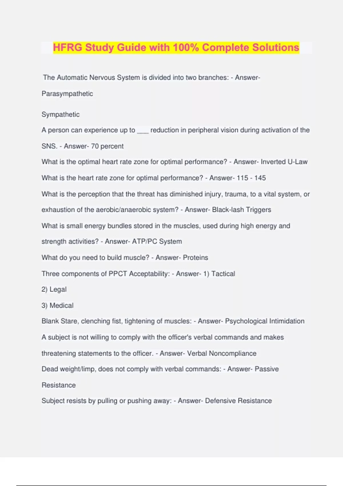 HFRG Study Guide with 100% Complete Solutions The Automatic Nervous System is divided into two branches: - Answer- Parasympathetic Sympathetic A person can experience up to ___ reduction in peripheral vision during activation of the SNS. - Answer- 70 percent What is the optimal heart rate zone for optimal performance? - Answer- Inverted U-Law What is the heart rate zone for optimal performance? - Answer- 115 - 145 What is the perception that the threat has diminished injury, trauma, to a vital system, or exhaustion of the aerobic/anaerobic system? - Answer- Black-lash Triggers What is small energy bundles stored in the muscles, used during high energy and strength activities? - Answer- ATP/PC System What do you need to build muscle? - Answer- Proteins Three components of PPCT Acceptability: - Answer- 1) Tactical 2) Legal 3) Medical Blank Stare, clenching fist, tightening of muscles: - Answer- Psychological Intimidation A subject is not willing to comply with the officer's verbal commands and makes threatening statements to the officer. - Answer- Verbal Noncompliance Dead weight/limp, does not comply with verbal commands: - Answer- Passive Resistance Subject resists by pulling or pushing away: - Answer- Defensive Resistance Physical actions/assault against the officer: - Answer- Active Aggression Force used against an officer that may cause serious bodily injury or death: - Answer- Deadly Force Assault If an officer applies a joint lock to a subject who has resisted him from the escort position, what's the level of control? - Answer- Soft Empty Hand Control Force used by an officer that may result in bodily injury or death. Officer uses bony portion of his hand to deliver a strike. - Answer- Deadly Force If an officer, dressed in full uniform arrives at the scene, what us the level of control? - Answer- Officer Presence