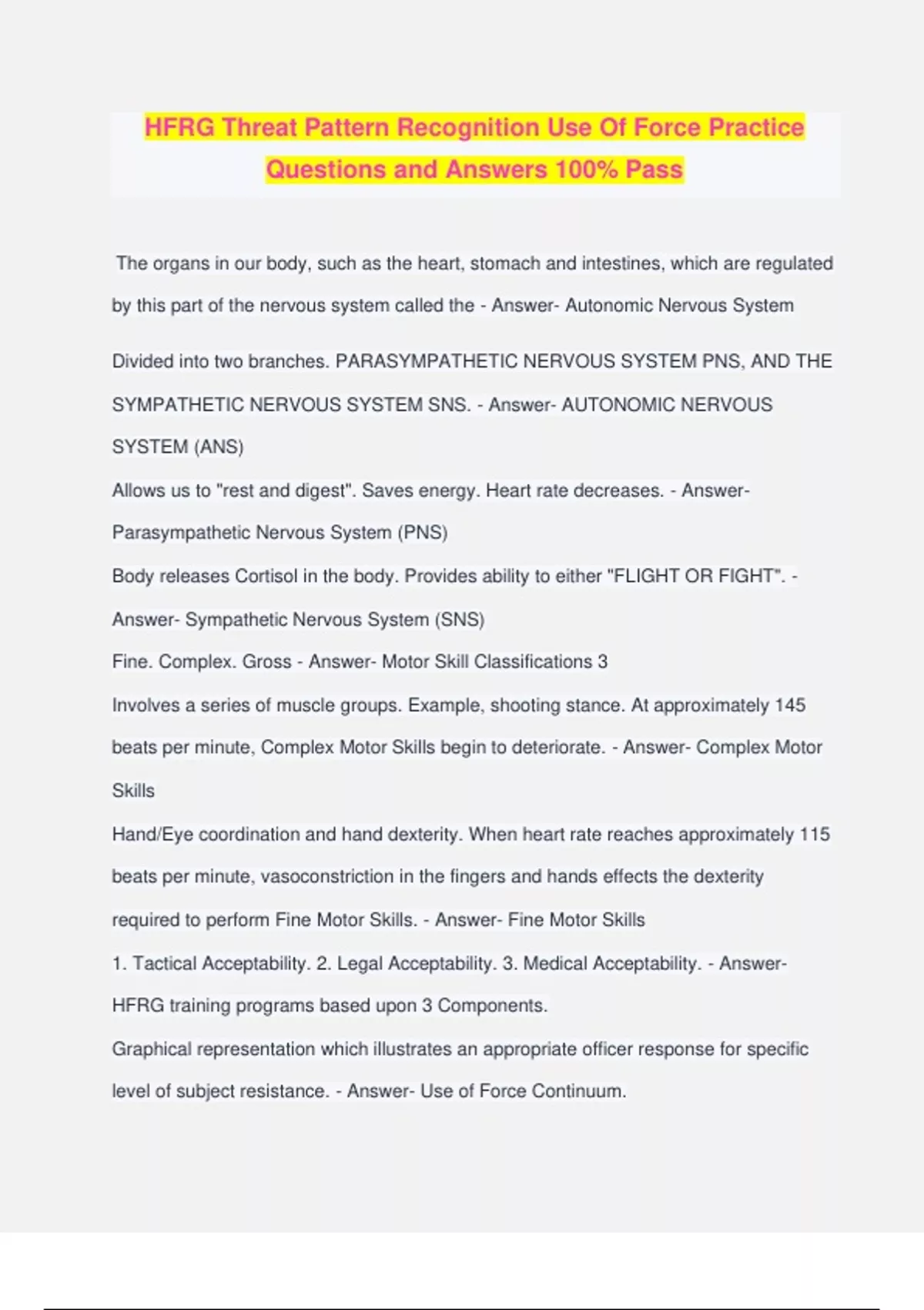 HFRG Threat Pattern Recognition Use Of Force Practice Questions and Answers 100% Pass The organs in our body, such as the heart, stomach and intestines, which are regulated by this part of the nervous system called the - Answer- Autonomic Nervous System Divided into two branches. PARASYMPATHETIC NERVOUS SYSTEM PNS, AND THE SYMPATHETIC NERVOUS SYSTEM SNS. - Answer- AUTONOMIC NERVOUS SYSTEM (ANS) Allows us to "rest and digest". Saves energy. Heart rate decreases. - Answer- Parasympathetic Nervous System (PNS) Body releases Cortisol in the body. Provides ability to either "FLIGHT OR FIGHT". - Answer- Sympathetic Nervous System (SNS) Fine. Complex. Gross - Answer- Motor Skill Classifications 3 Involves a series of muscle groups. Example, shooting stance. At approximately 145 beats per minute, Complex Motor Skills begin to deteriorate. - Answer- Complex Motor Skills Hand/Eye coordination and hand dexterity. When heart rate reaches approximately 115 beats per minute, vasoconstriction in the fingers and hands effects the dexterity required to perform Fine Motor Skills. - Answer- Fine Motor Skills 1. Tactical Acceptability. 2. Legal Acceptability. 3. Medical Acceptability. - Answer- HFRG training programs based upon 3 Components. Graphical representation which illustrates an appropriate officer response for specific level of subject resistance. - Answer- Use of Force Continuum