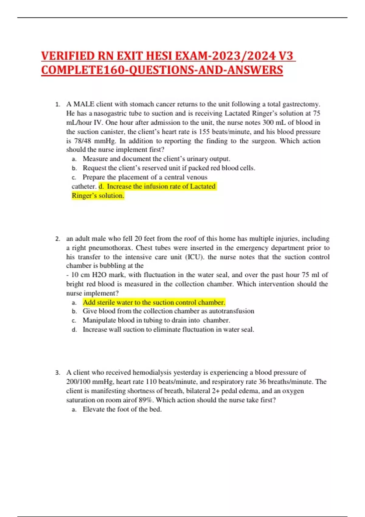 1. A MALE client with stomach cancer returns to the unit following a total gastrectomy. He has a nasogastric tube to suction and is receiving Lactated Ringer’s solution at 75 mL/hour IV. One hour after admission to the unit, the nurse notes 300 mL of blood in the suction canister, the client’s heart rate is 155 beats/minute, and his blood pressure is 78/48 mmHg. In addition to reporting the finding to the surgeon. Which action should the nurse implement first? a. Measure and document the client’s urinary output. b. Request the client’s reserved unit if packed red blood cells. c. Prepare the placement of a central venous catheter. d. Increase the infusion rate of Lactated Ringer’s solution. 2. an adult male who fell 20 feet from the roof of this home has multiple injuries, including a right pneumothorax. Chest tubes were inserted in the emergency department prior to his transfer to the intensive care unit (ICU). the nurse notes that the suction control chamber is bubbling at the - 10 cm H2O mark, with fluctuation in the water seal, and over the past hour 75 ml of bright red blood is measured in the collection chamber. Which intervention should the nurse implement? a. Add sterile water to the suction control chamber. b. Give blood from the collection chamber as autotransfusion c. Manipulate blood in tubing to drain into chamber. d. Increase wall suction to eliminate fluctuation in water seal. 3. A client who received hemodialysis yesterday is experiencing a blood pressure of 200/100 mmHg, heart rate 110 beats/minute, and respiratory rate 36 breaths/minute. The client is manifesting shortness of breath, bilateral 2+ pedal edema, and an oxygen saturation on room airof 89%. Which action should the nurse take first? a. Elevate the foot of the bed. b. Restrict the client’s fluid. c. Begin supplemental oxygen. d. Prepare the client for hemodialysis. 4. A client with Addison’s crisis is admitted for treatment with adrenal cortical supplementation. Based on the client’s admitting diagnosis, which findings require immediate action by the nurse?(Select all that apply) a. Headache and tremors b. Irregular heart rate c. Skin hyperpigmentation d. Postural hypotension e. Pallor and diaphoresis 5. An older client is admitted with fluid volume deficit and dehydration. Which assessment findingis the best indicator of hydration that the nurse should report to the healthcare provider? a. Urine specific gravity is 1.040 b. Systolic blood pressure decreases 10 points when standing. c. The client denies being thirsty. d. Skin tenting occurs when the client’s forearm is pinched. 6. After an inservice about electronic health record (EHR) security and safeguarding clientinformation, the nurse observes a colleague going home with printed copies of client information in a uniform pocket. Which action should the nurse take? a. File a detailed incident report with the specific hiring facility. b. Warn the colleague that their actions ar