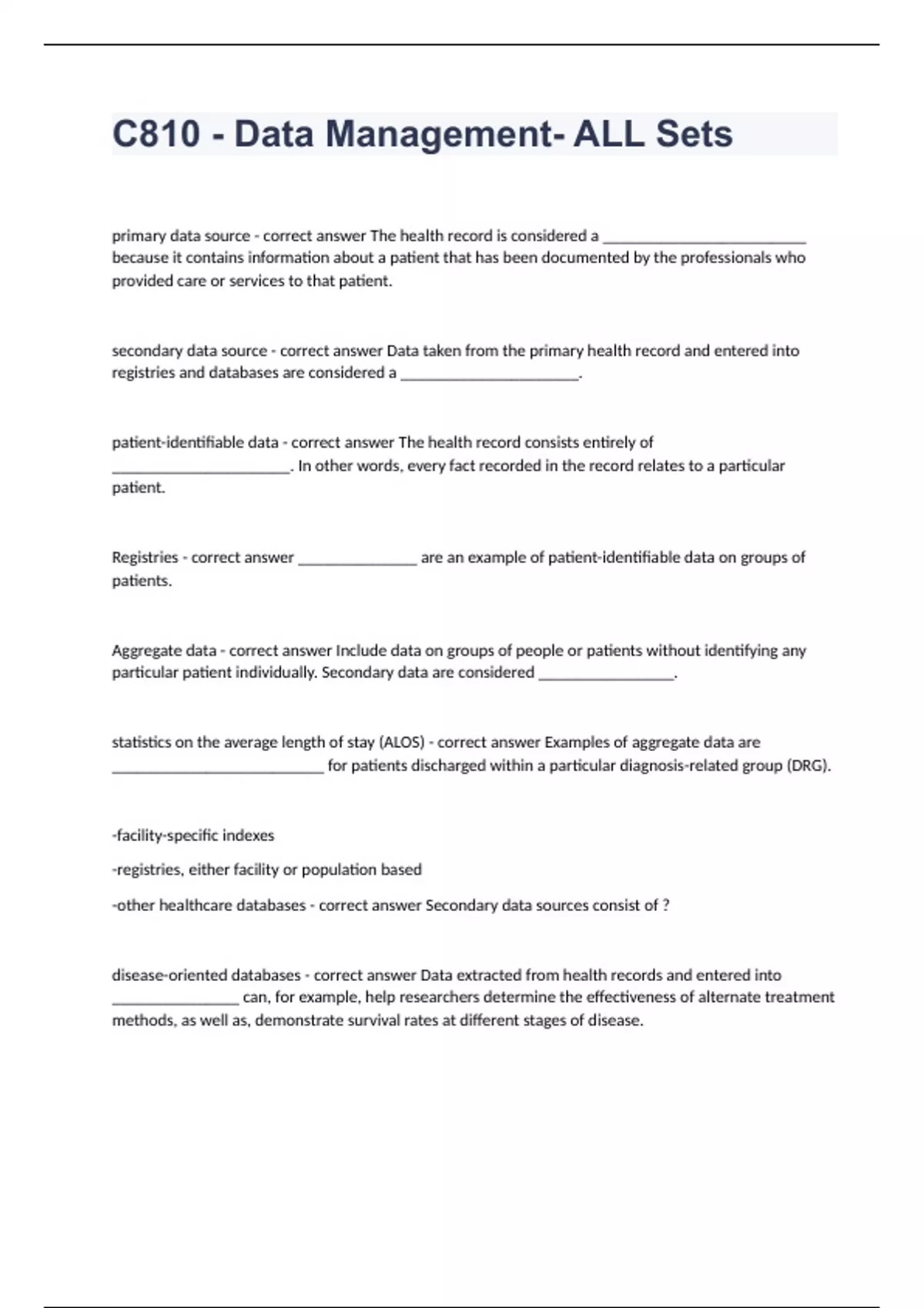 C810 - Data Management- ALL Sets Questions With Correct Answers 2024. primary data source - correct answer The health record is considered a ________________________ because it contains information about a patient that has been documented by the professionals who provided care or services to that patient. secondary data source - correct answer Data taken from the primary health record and entered into registries and databases are considered a _____________________. patient-identifiable data - correct answer The health record consists entirely of _____________________. In other words, every fact recorded in the record relates to a particular patient. Registries - correct answer ______________ are an example of patient-identifiable data on groups of patients. Aggregate data - correct answer Include data on groups of people or patients without identifying any particular patient individually. Secondary data are considered ________________. statistics on the average length of stay (ALOS) - correct answer Examples of aggregate data are _________________________ for patients discharged within a particular diagnosis-related group (DRG). -facility-specific indexes -registries, either facility or population based -other healthcare databases - correct answer Secondary data sources consist of ?