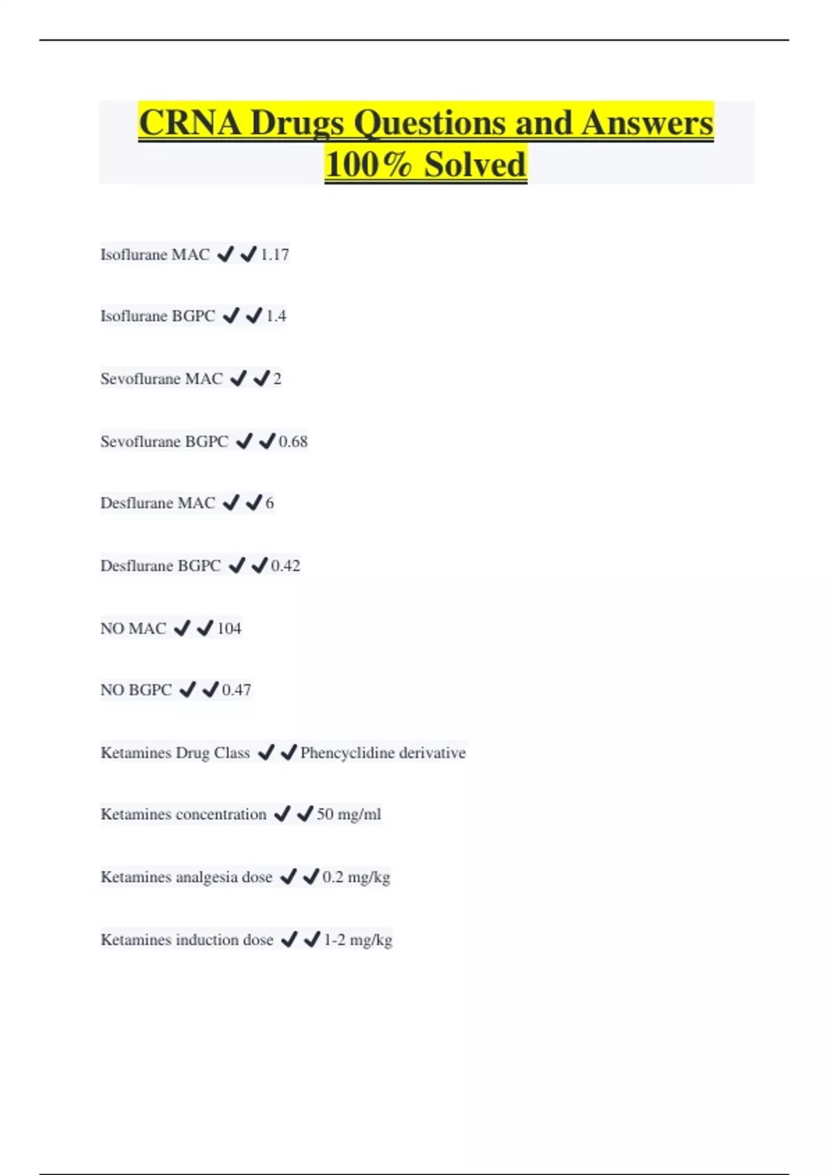 CRNA Drugs Questions and Answers 100% Solved Isoflurane MAC ️️1.17 Isoflurane BGPC ️️1.4 Sevoflurane MAC ️️2 Sevoflurane BGPC ️️0.68 Desflurane MAC ️️6 Desflurane BGPC ️️0.42 NO MAC ️️104 NO BGPC ️️0.47 Ketamines Drug Class ️️Phencyclidine derivative Ketamines concentration ️️50 mg/ml Ketamines analgesia dose ️️0.2 mg/kg