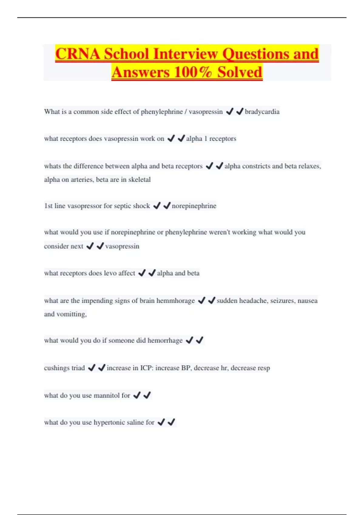 CRNA School Interview Questions and Answers 100% Solved What is a common side effect of phenylephrine / vasopressin ️️bradycardia what receptors does vasopressin work on ️️alpha 1 receptors whats the difference between alpha and beta receptors ️️alpha constricts and beta relaxes, alpha on arteries, beta are in skeletal 1st line vasopressor for septic shock ️️norepinephrine what would you use if norepinephrine or phenylephrine weren't working what would you consider next ️️vasopressin what receptors does levo affect ️️alpha and beta what are the impending signs of brain hemmhorage ️️sudden headache, seizures, nausea and vomitting, what would you do if someone did hemorrhage ️️ cushings triad ️️increase in ICP: increase BP, decrease hr, decrease resp what do you use mannitol for ️️ what do you use hypertonic saline for ️