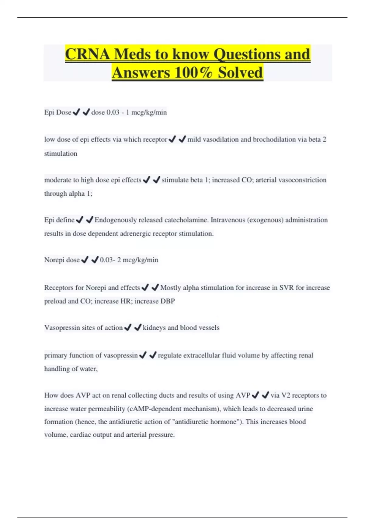 CRNA Meds to know Questions and Answers 100% Solved Epi Dose️️dose 0.03 - 1 mcg/kg/min low dose of epi effects via which receptor️️mild vasodilation and brochodilation via beta 2 stimulation moderate to high dose epi effects️️stimulate beta 1; increased CO; arterial vasoconstriction through alpha 1; Epi define️️Endogenously released catecholamine. Intravenous (exogenous) administration results in dose dependent adrenergic receptor stimulation. Norepi dose️️0.03- 2 mcg/kg/min Receptors for Norepi and effects️️Mostly alpha stimulation for increase in SVR for increase preload and CO; increase HR; increase DBP Vasopressin sites of action️️kidneys and blood vessels primary function of vasopressin️️regulate extracellular fluid volume by affecting renal handling of water, How does AVP act on renal collecting ducts and results of using AVP️️via V2 receptors to increase water permeability (cAMP-dependent mechanism), which leads to decreased urine formation (hence, the antidiuretic action of "antidiuretic hormone"). This increases blood volume, cardiac output and arterial pressure