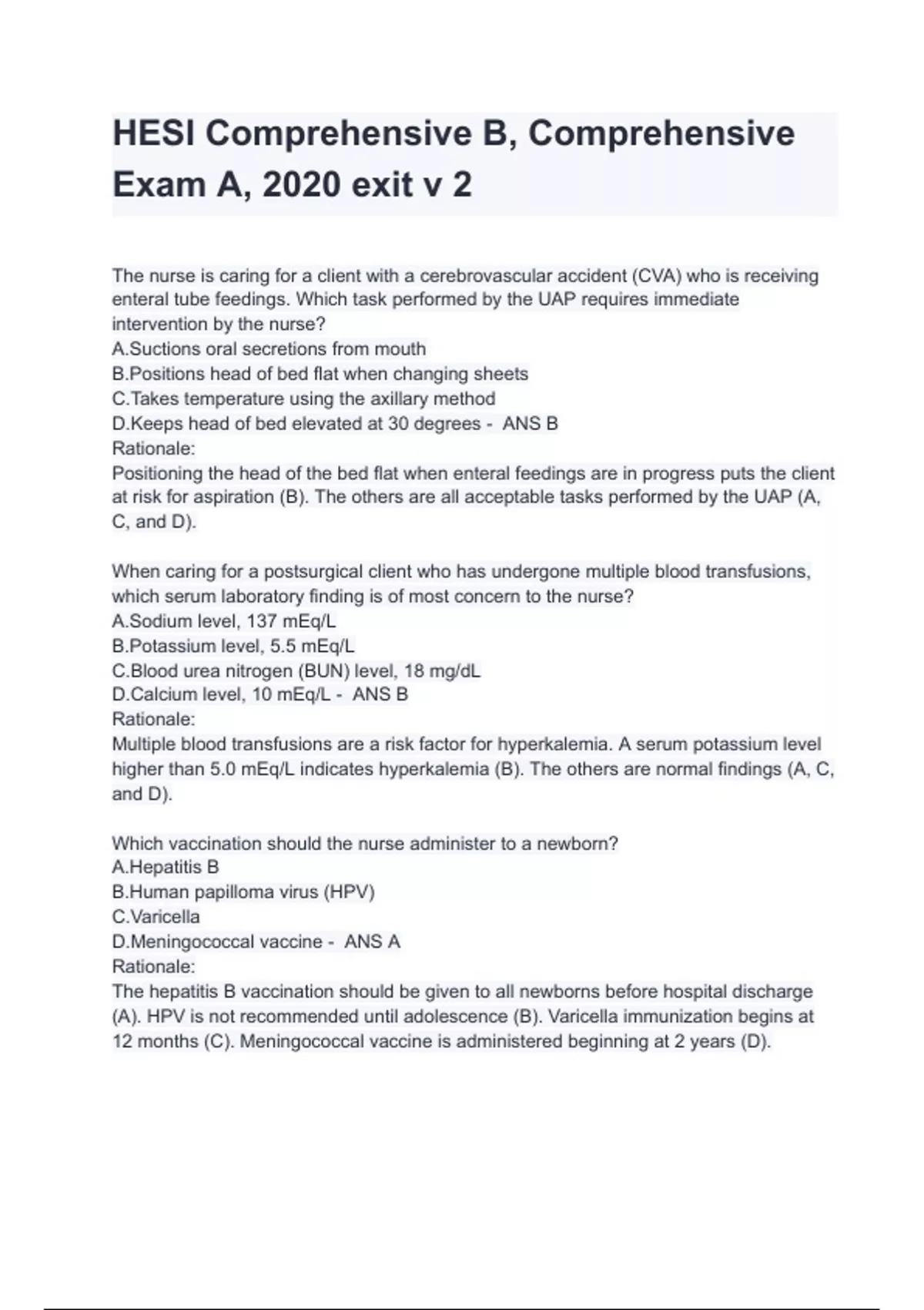 HESI Comprehensive B, Comprehensive Exam A, 2020 exit v 2 2024 Questions And Answers