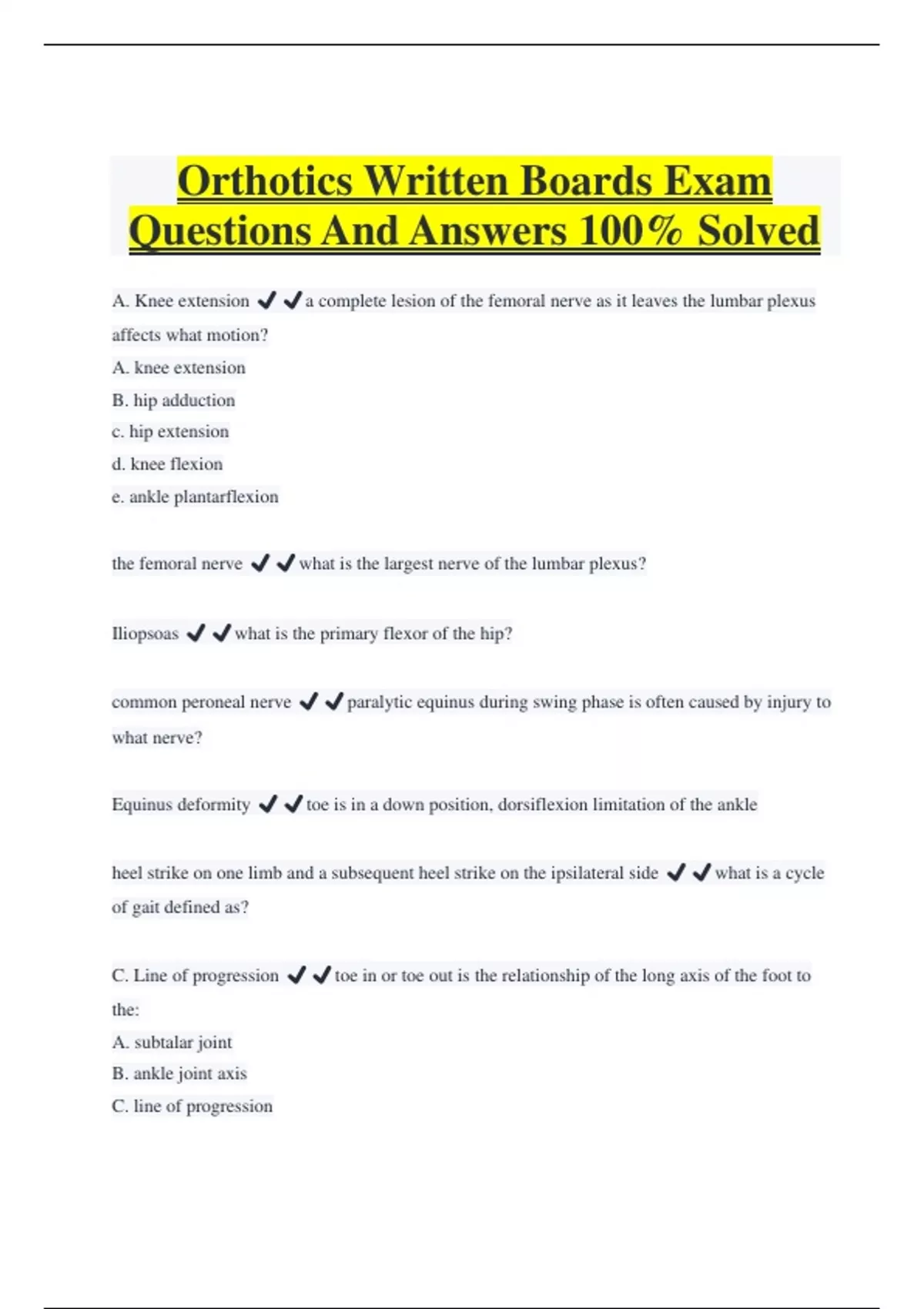 Orthotics Written Boards Exam Questions And Answers 100% Solved A. Knee extension ️️a complete lesion of the femoral nerve as it leaves the lumbar plexus affects what motion? A. knee extension B. hip adduction c. hip extension d. knee flexion e. ankle plantarflexion the femoral nerve ️️what is the largest nerve of the lumbar plexus? Iliopsoas ️️what is the primary flexor of the hip? common peroneal nerve ️️paralytic equinus during swing phase is often caused by injury to what nerve? Equinus deformity ️️toe is in a down position, dorsiflexion limitation of the ankle heel strike on one limb and a subsequent heel strike on the ipsilateral side ️️what is a cycle of gait defined as? C. Line of progression ️️toe in or toe out is the relationship of the long axis of the foot to the: A. subtalar joint B. ankle joint axis C. line of progression