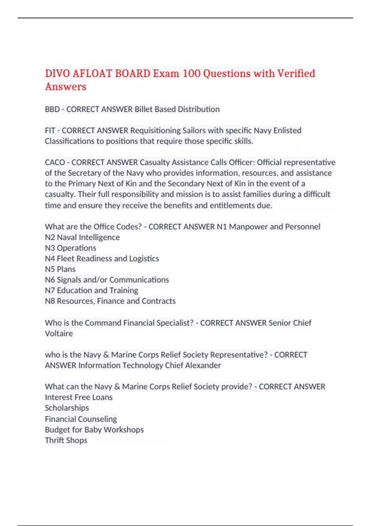 DIVO AFLOAT BOARD Exam 100 Questions with Verified Answers BBD - CORRECT ANSWER Billet Based Distribution FIT - CORRECT ANSWER Requisitioning Sailors with specific Navy Enlisted Classifications to positions that require those specific skills. CACO - CORRECT ANSWER Casualty Assistance Calls Officer: Official representative of the Secretary of the Navy who provides information, resources, and assistance to the Primary Next of Kin and the Secondary Next of Kin in the event of a casualty. Their full responsibility and mission is to assist families during a difficult time and ensure they receive the benefits and entitlements due. What are the Office Codes? - CORRECT ANSWER N1 Manpower and Personnel N2 Naval Intelligence N3 Operations N4 Fleet Readiness and Logistics N5 Plans N6 Signals and/or Communications N7 Education and Training N8 Resources, Finance and Contracts Who is the Command Financial Specialist? - CORRECT ANSWER Senior Chief Voltaire who is the Navy & Marine Corps Relief Society Representative? - CORRECT ANSWER Information Technology Chief Alexander What can the Navy & Marine Corps Relief Society provide? - CORRECT ANSWER Interest Free Loans Scholarships Financial Counseling Budget for Baby Workshops Thrift Shops Visiting Nurse Services How long can pregnant women remain on board a ship? - CORRECT ANSWER until the 20th week. While underway or deployed they should be transferred ashore as soon as possible. They may continue to serve on board ships while in port or during short underway periods given that a medical facility is less than 6 hours in distance. Physical Standards during pregnancy: - CORRECT ANSWER exceeding weight standards during pregnancy and up until 6 months after giving birth are not a cause for adverse fitness reports or evaluations Who is the Drug and Alcohol Prevention Advocate (DAPA) on board? - CORRECT ANSWER Chief Hammond and IC1 Alli Who is the Command Security Manager on board? - CORRECT ANSWER Executive Officer Who is the Command Security Manager Coordinator on board? - CORRECT ANSWER TIWO Who is the Suicide Prevention Coordinator on board? - CORRECT ANSWER Senior Chief Ortiz and YN1 Moorer Who is the Command Career Counselor? - CORRECT ANSWER NC1 Carillo Who is the Information Security Manager? - CORRECT ANSWER Information Systems Officer Sexual Assault & Prevention Coordinator: - CORRECT ANSWER Senior Chief Bellnoski Sexual Assault and Prevention Victim Advocates - CORRECT ANSWER YN2 Robinson Lieutenant Junior Grade Wehmeyer Sexual Assault Command Coordinator - CORRECT ANSWER Ms. Olivia Zecchini CMEO - CORRECT ANSWER 3MC Burnett Who is the Ombudsman? - CORRECT ANSWER Mrs. Mitchell - CORRECT ANSWER Who is the Casualty Assistance Calls Officer - CORRECT ANSWER Chief Vandeventure Apprehension towards Commissioned Officers for UCMJ - CORRECT ANSWER Non commissioned and Petty Officers not otherwise performing law enforcement duties should not apprehend a commissioned officer unless directed to do so by a commissioned officer or in order to prevent disgrace to the service or the escape of one who has committed a serious offense Civilians Authorized to Apprehend Deserters - CORRECT ANSWER Under Article 8, any civilian officer having authority to apprehend offenders under laws of the United States or of State, Territory, Commonwealth, or possession, or the District of Columbia, when the apprehension is of a deserter from the armed forces. U C M J - CORRECT ANSWER Uniform Code of Military Justice Parts of the JAGMAN - CORRECT ANSWER Part A: Regulations and Procedures governing non punitive corrective measures Part B: Regulations and Procedures relating to Nonjudicial Punishment Part C: Trial by Court Martial, divided into 3 sub parts - pretrial - trail - post trial Part D: miscellaneous provisions Extra Military Instruction - CORRECT ANSWER A bonafide training technique that attempts to improve an individual's performance by logically focusing additional effort on some related deficiency in the performance for which it was assigned. Extra military duty is neither: - CORRECT ANSWER hard labor without confinement, nor extra duty, which may only be imposed by courts-martial or non judicial punishment, respectively. Extra Military Instruction Limitations - CORRECT ANSWER 1. Normally will not be conducted for more than 2 hours 2. E M I conducted outside of normal working hours will be conducted consecutively with the service member's work day 3. When the deficiency is corrected, it must cease 4. Will not be assigned on a service member's Sabbath 5. Will not be used for the purpose of depriving the service member of normal liberty to which he/she is otherwise entitled. 6. Authority to assig extra military instruction during normal working hours is an inherent part of the authorities that officers, non commissioned officers, & Petty officers have over subordinates. 7. only a commander or officer in charge may authorize extra military instruction outside of normal working hours and may not delegate this authority unless authorized to do so by the Chief of Naval Operations or the Commandant of the Marine Corps Standard Subject Identification Codes: - CORRECT ANSWER 1000 Military Personnel 2000 Information Technology and Communications 3000 Operations and Readiness 4000 Logistics 5000 General Administration and Management 6000 Medicine and Dentistry 7000 Financial Management 8000 Ordinance Material 9000 Ships Design and Material 10000 General Material 11000 Facilities and Activities Ashore 12000 Civilian Personnel 13000 Aeronautical and Astronomical Casualty Report Categories - CORRECT ANSWER CAT 2: Minor degregation in any primary warfare mission area or major degradation to a secondary mission area CAT 3: Major degregation but not total loss of primary mission warfare area. CAT 4: Major degregation or causes of loss of at least one primary mission area Types of Casualty Reports - CORRECT ANSWER Initial Update: changes to information Correction: The equipment has been re