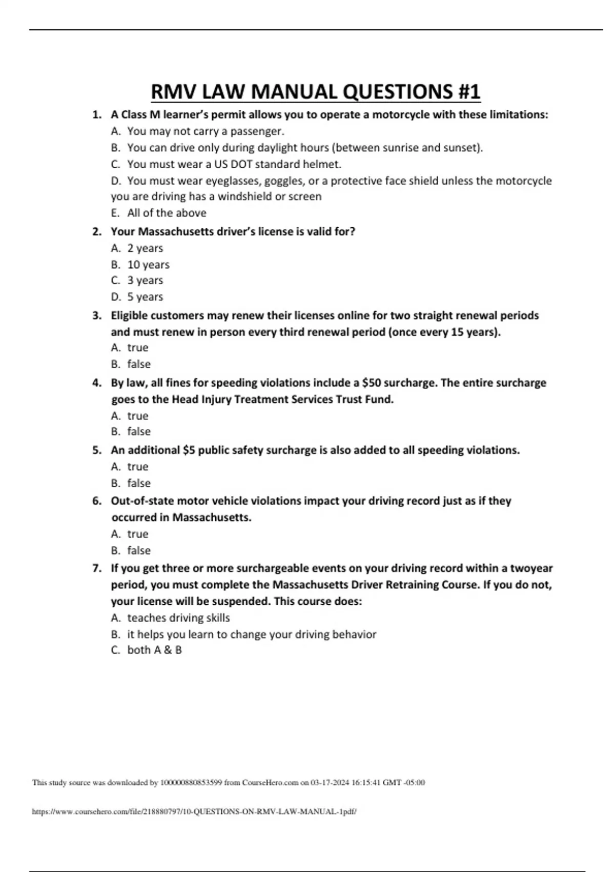 1. A Class M learner’s permit allows you to operate a motorcycle with these limitations: A. You may not carry a passenger. B. You can drive only during daylight hours (between sunrise and sunset). C. You must wear a US DOT standard helmet. D. You must wear eyeglasses, goggles, or a protective face shield unless the motorcycle you are driving has a windshield or screen E. All of the above 2. Your Massachusetts driver’s license is valid for? A. 2 years B. 10 years C. 3 years D. 5 years 3. Eligible customers may renew their licenses online for two straight renewal periods and mus
