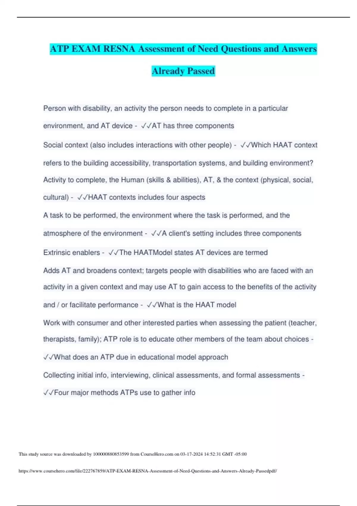 ATP EXAM RESNA Assessment of Need Questions and Answers Already Passed.