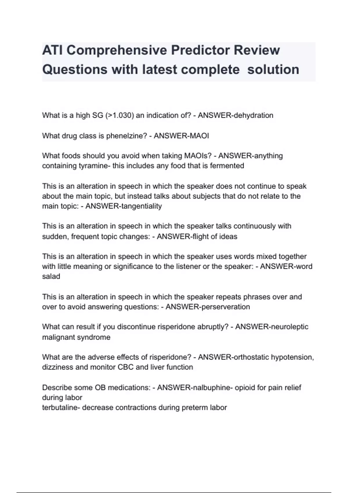 ATI Comprehensive Predictor Review Questions with latest complete solution What is a high SG (>1.030) an indication of? - ANSWER-dehydration What drug class is phenelzine? - ANSWER-MAOI What foods should you avoid when taking MAOIs? - ANSWER-anything containing tyramine- this includes any food that is fermented This is an alteration in speech in which the speaker does not continue to speak about the main topic, but instead talks about subjects that do not relate to the main topic: - ANSWER-tangentiality This is an alteration in speech in which the speaker talks continuously with sudden, frequent topic changes: - ANSWER-flight of ideas This is an alteration in speech in which the speaker uses words mixed together with little meaning or significance to the listener or the speaker: - ANSWER-word salad This is an alteration in speech in which the speaker repeats phrases over and over to avoid answering questions: - ANSWER-perserveration What can result if you discontinue risperidone abruptly? - ANSWER-neuroleptic malignant syndrome What are the adverse effects of risperidone? - ANSWER-orthostatic hypotension, dizziness and monitor CBC and liver function Describe some OB medications: - ANSWER-nalbuphine- opioid for pain relief during labor