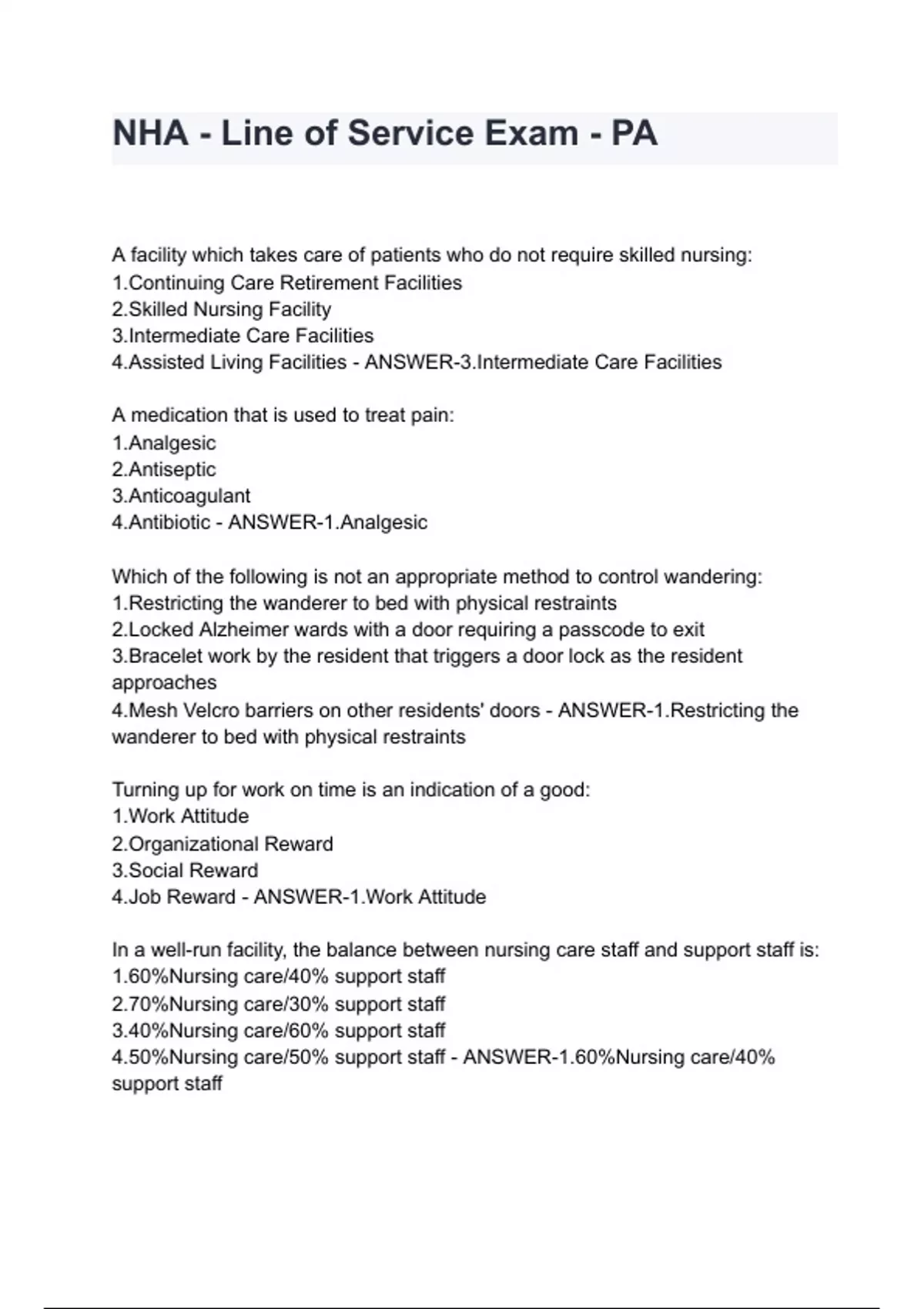 A facility which takes care of patients who do not require skilled nursing: 1.Continuing Care Retirement Facilities 2.Skilled Nursing Facility 3.Intermediate Care Facilities 4.Assisted Living Facilities - ANSWER-3.Intermediate Care Facilities A medication that is used to treat pain: 1.Analgesic 2.Antiseptic 3.Anticoagulant 4.Antibiotic - ANSWER-1.Analgesic Which of the following is not an appropriate method to control wandering: 1.Restricting the wanderer to bed with physical restraints 2.Lock