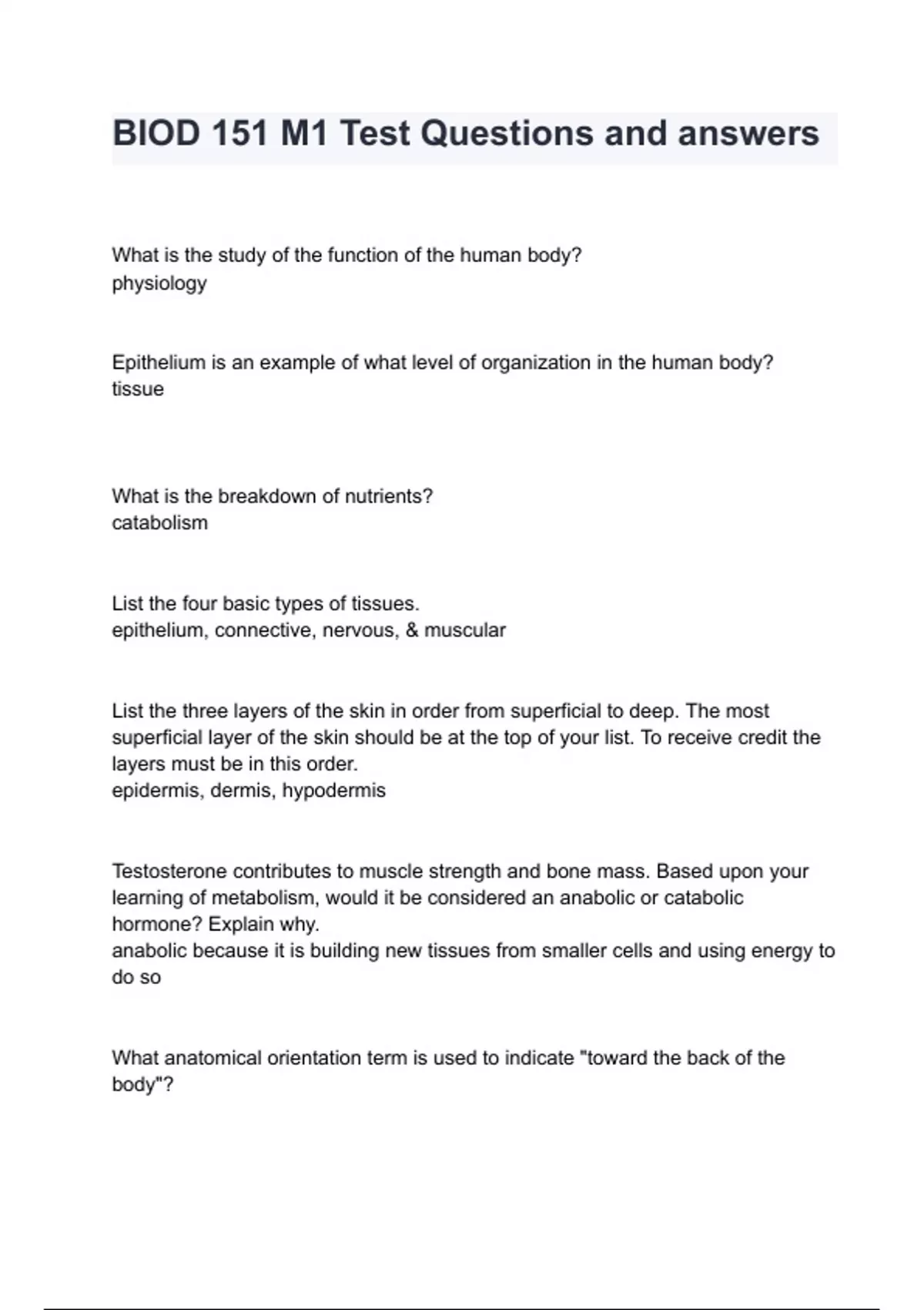 BIOD 151 M1 Test Questions and answers What is the study of the function of the human body? physiology Epithelium is an example of what level of organization in the human body? tissue What is the breakdown of nutrients? catabolism List the four basic types of tissues. epithelium, connective, nervous, & muscular List the three layers of the skin in order from superficial to deep. The most superficial lay