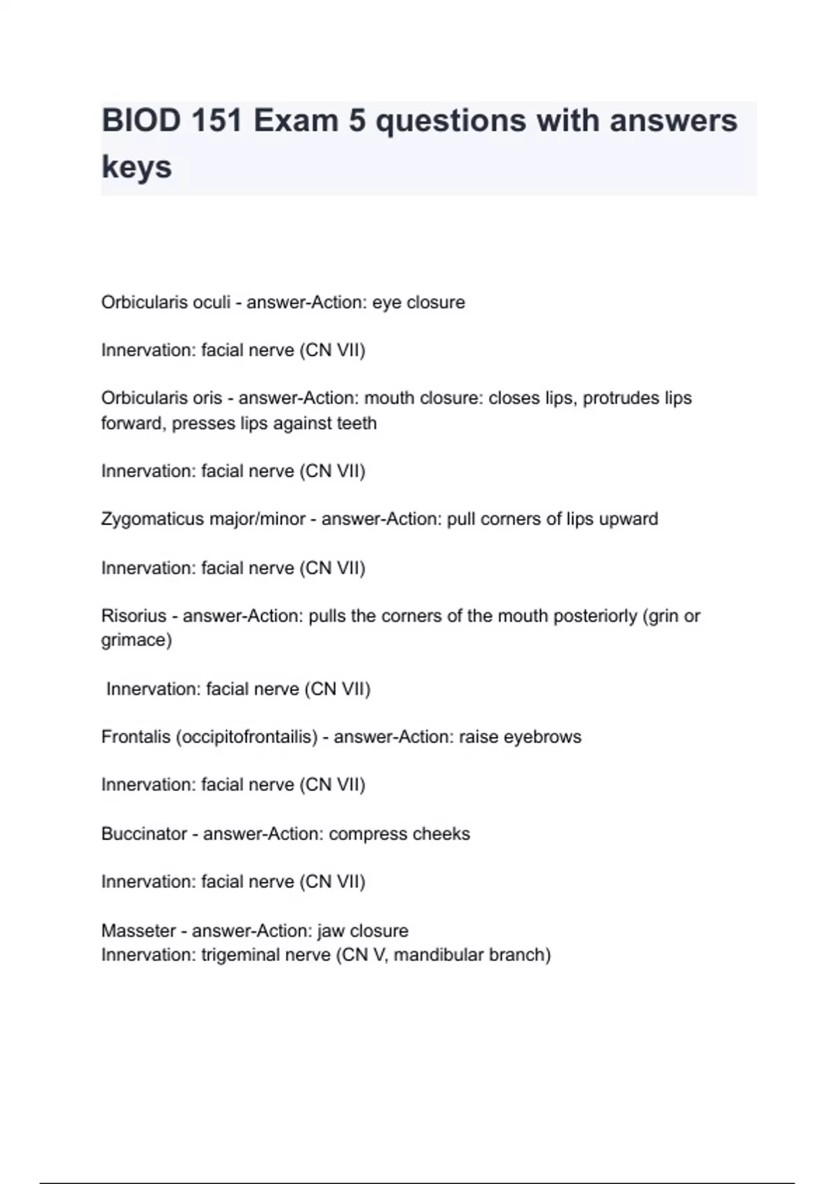 BIOD 151 Exam 5 questions with answers keys Orbicularis oculi - answer-Action: eye closure Innervation: facial nerve (CN VII) Orbicularis oris - answer-Action: mouth closure: closes lips, protrudes lips forward, presses lips against teeth Innervation: facial nerve (CN VII) Zygomaticus major/minor - answer-Action: pull corners of lips upward Innervation: facial nerve (CN VII) Risorius - answer-Action: pulls the corners of the mouth posteriorly (grin or grimace) Innervation: facial nerve (CN VII) Frontalis (occipitofrontailis) - answer-Action: raise eyebrows Innervation: facial nerve (CN VII) Buccinator - answer-A