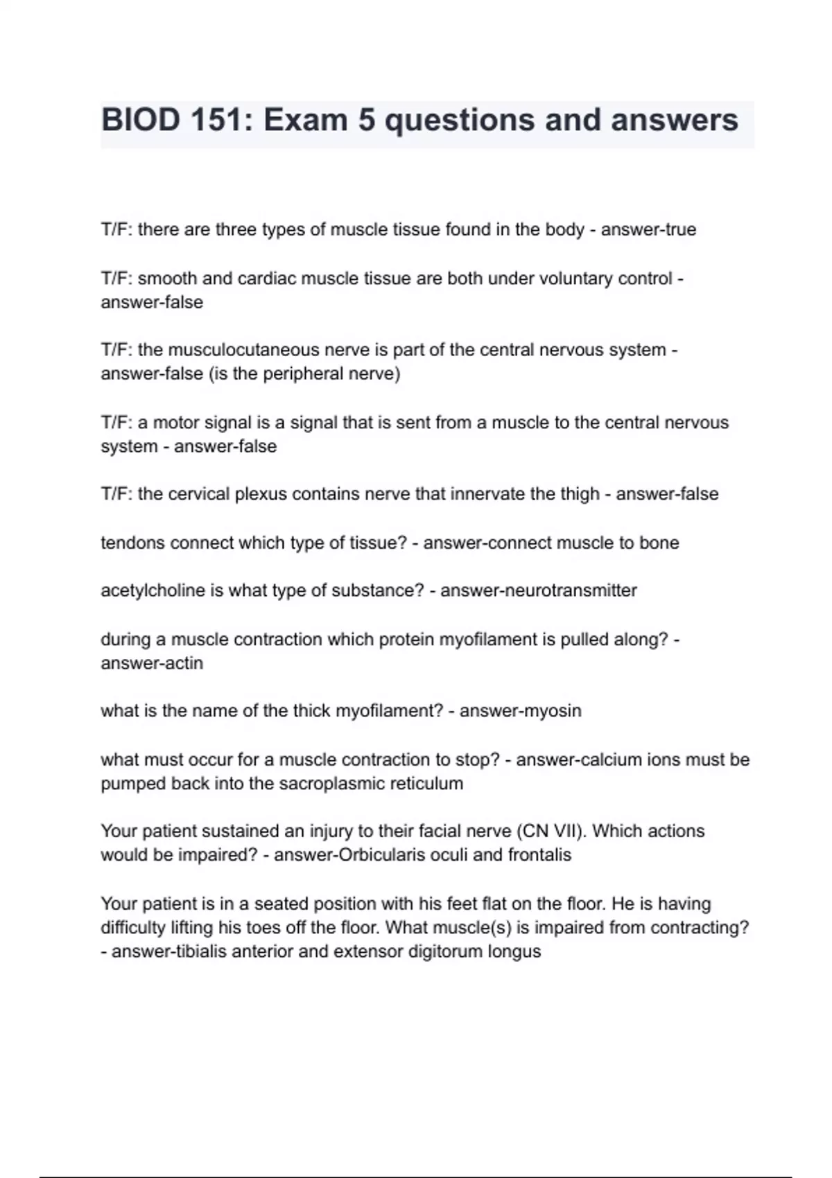 BIOD 151: Exam 5 questions and answers T/F: there are three types of muscle tissue found in the body - answer-true T/F: smooth and cardiac muscle tissue are both under voluntary control - answer-false T/F: the musculocutaneous nerve is part of the central nervous system - answer-false (is the peripheral nerve) T/F: a motor signal is a signal that is sent from a muscle to the central nervous system - answer-false T/F: the cervical plexus contains nerve that innervate the thigh - answer-false tendons connect which type of tissue? - answer-connect muscle to bone acetylcholine is what type of substance? - answer-neurotransmitter during a muscle contraction which protein myofilament is pulled along? - answer-actin what is the name of the thick myofilament? - answer-myosin what must occur for a muscle contraction to stop? - answer-calcium ions must be pumped back