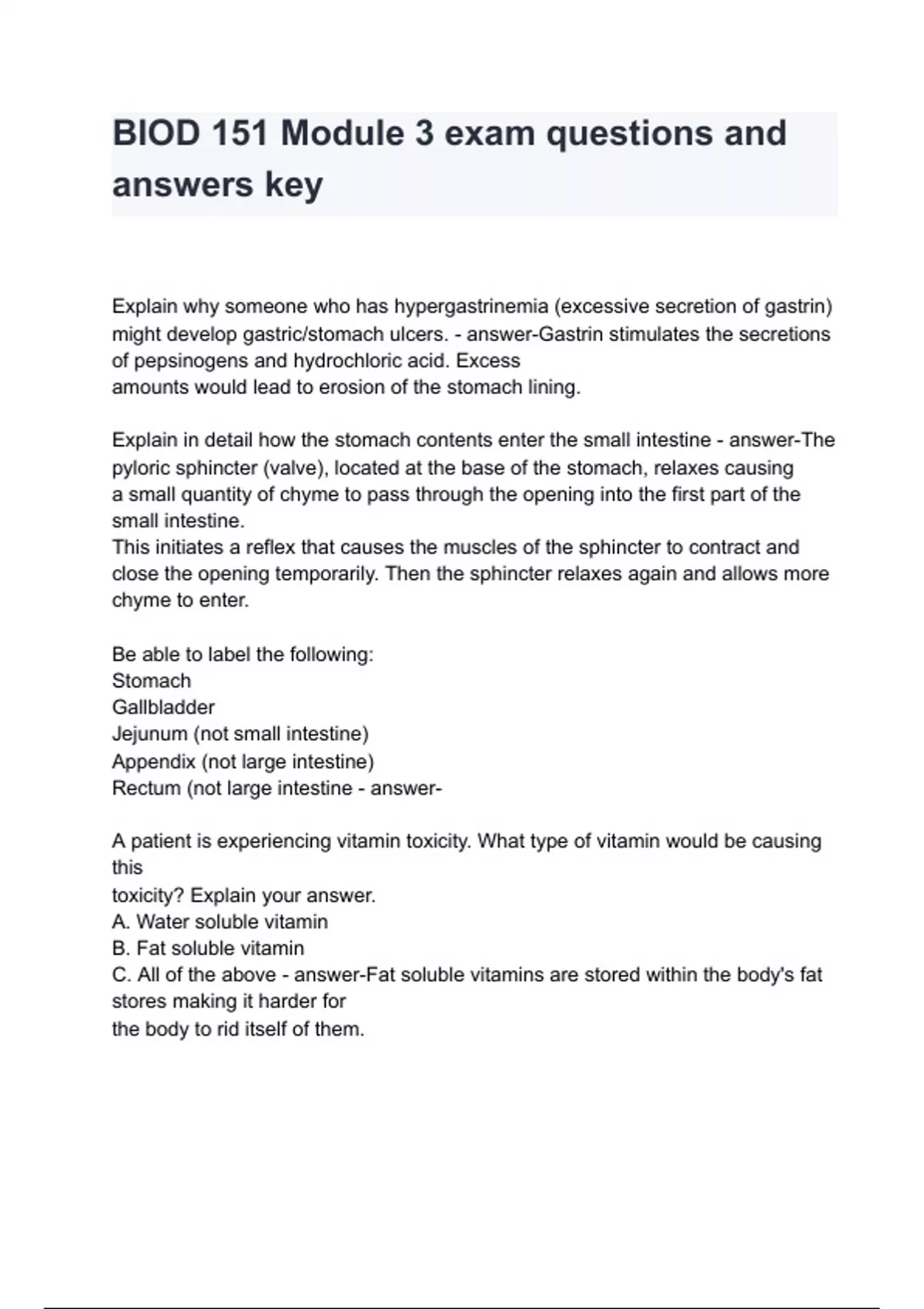 BIOD 151 Module 3 exam questions and answers key Explain why someone who has hypergastrinemia (excessive secretion of gastrin) might develop gastric/stomach ulcers. - answer-Gastrin stimulates the secretions of pepsinogens and hydrochloric acid. Excess amounts would lead to erosion of the stomach lining. Explain in detail how the stomach contents enter the small intestine - answer-The pyloric sphincter (valve), located at the base of the stomach, relaxes causing a small quantity of chyme to pass through the opening into the first part of the small intestine. This initiates a reflex that causes the muscles of the sphincter to contract and close the opening temporarily. Then the sphincter relaxes again and allows more chyme to enter. Be able to label the following: Stomach Gallbladder Jejunum (not sm