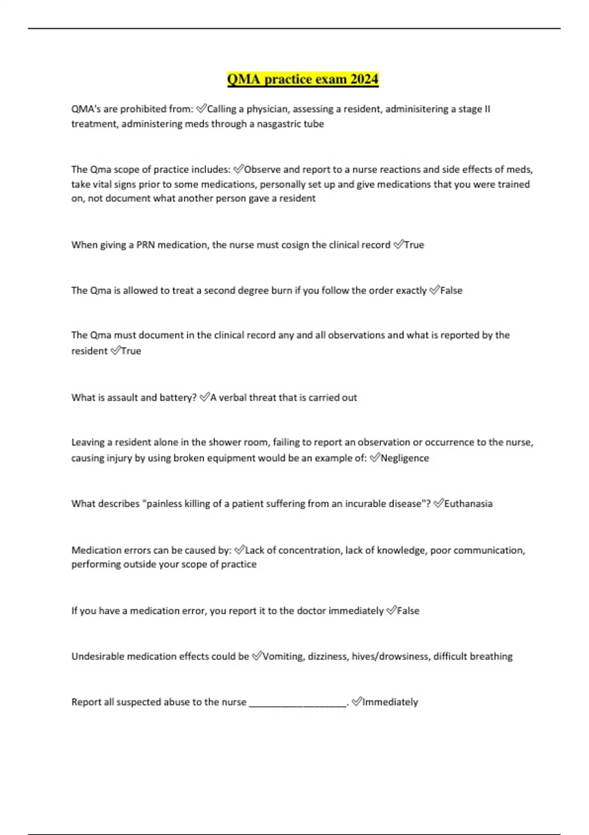 QMA practice exam 2024 QMA's are prohibited from: Calling a physician, assessing a resident, adminisitering a stage II treatment, administering meds through a nasgastric tube The Qma scope of practice includes: Observe and report to a nurse reactions and side effects of meds, take vital signs prior to some medications, personally set up and give medications that you were trained on, not document what another person gave a resident When giving a PRN medication, the nurse must cosign the clinical record True The Qma is allowed to treat a second degree burn if you follow the order exactly False The Qma must document in the clinical record any and all observations and what is reported by the resident True What is assault and battery? A verbal threat that is carried out Leaving a resident alone in the shower room, failing to report an observation or occurrence to the nurse, causing injury by using broken equipment would be an example of: Negligence What describes "painless killing of a patient suffering from an incurable disease"? Euthanasia Medication errors can be caused by: Lack of concentration, lack of knowledge, poor communication, performing outside your scope of practice If you have a medication error, you report it to the doctor immediately False Undesirable medication effects could be Vomiting, dizziness, hives/drowsiness, difficult breathing Report all suspected abuse to the nurse __________________. Immediately The Qma is exempt from performing the initial and final steps created for Cna's False What is verbal communication? Written or spoken words What can cause permanent cognitive impairment? Severe head trauma Stroke Brain disease What is sundowning? Increased confusion and restlessness in late afternoon When interacting with an anxious resident you should: Provide a quiet, calm environment away from groups When interacting with a combative resident you should: Remain calm and in control What is nosocomial infection? An infection squired while in a facility What is hepatitis? A contagious liver disease If you have a spill on the floor, you must use: Gloves, paper towels, wet floor sign When do you clean up a spill? Immediately In the event of a fire, what does the R stand for? Remove residents To use a fir extinguisher, what does the P stand for? Pull the pin Medications: the trade/brand name is always: Capital letters Synthetic medications are: Man-made The systemic effect of a medication _______________. Effects the entire body The effects of medication is ________________. The observable results of changes in the body An antagonistic effect is _________________. Negative effect that one chemical have with another chemical What is ADR? An undesired side effect or toxicity What organ excretes most medications? Kidneys What are legend medications? Medication that can only be obtained with a prescription Qma's can take phone orders if they repeat the order back to the doctor for accuracy. False What is absorption? Medication moves from the site of administration into the bloodstream