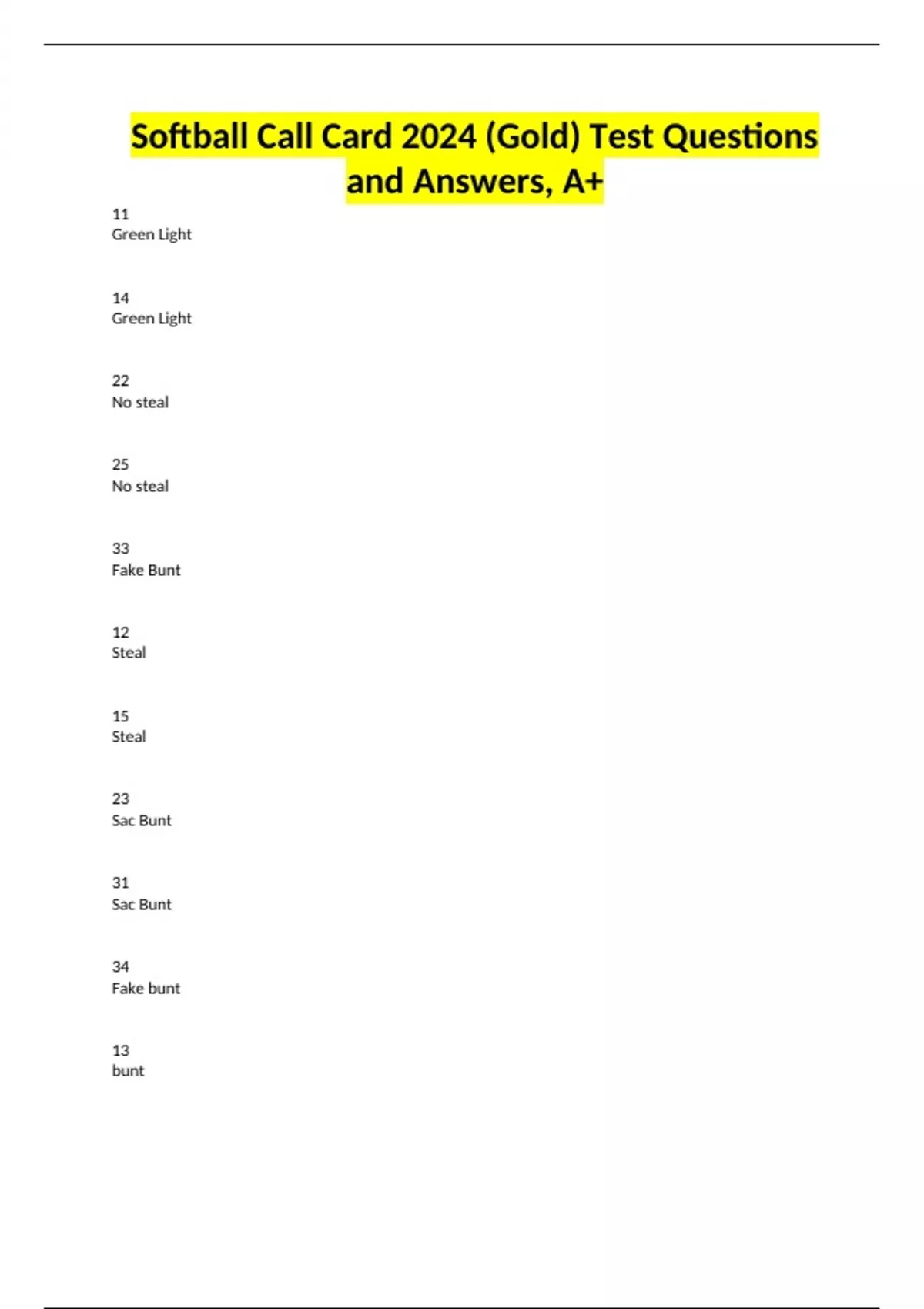 Softball Call Card 2024 (Gold) Test Questions and Answers, A+