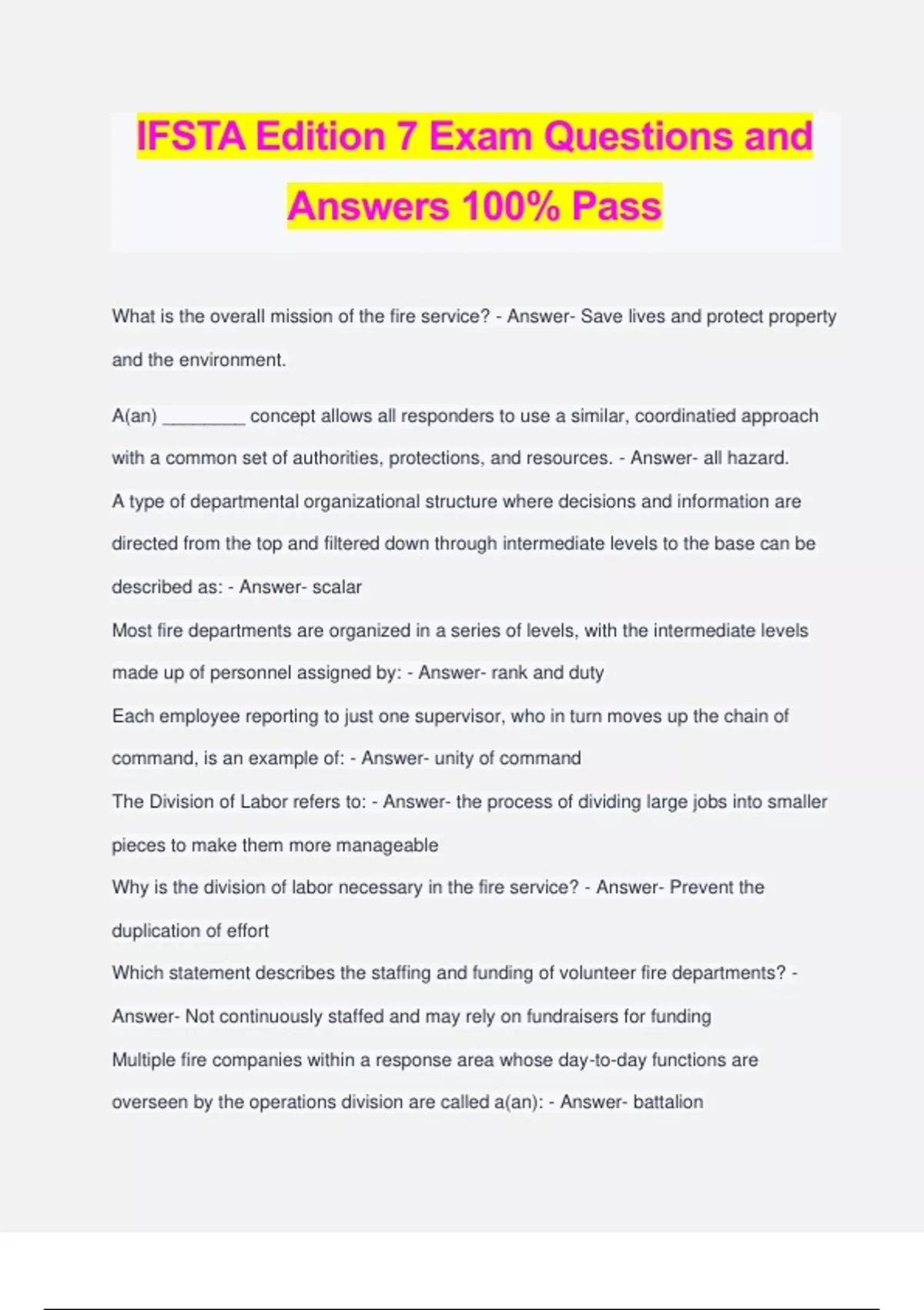 IFSTA Edition 7 Exam Questions and Answers 100% Pass What is the overall mission of the fire service? - Answer- Save lives and protect property and the environment. A(an) ________ concept allows all responders to use a similar, coordinatied approach with a common set of authorities, protections, and resources. - Answer- all hazard. A type of departmental organizational structure where decisions and information are directed from the top and filtered down through intermediate levels to the base can be described as: - Answer- scalar Most fire departments are organized in a series of levels, with the intermediate levels made up of personnel assigned by: - Answer- rank and duty Each employee reporting to just one supervisor, who in turn moves up the chain of command, is an example of: - Answer- unity of command The Division of Labor refers to: - Answer- the process of dividing large jobs into smaller pieces to make them more manageable Why is the division of labor necessary in the fire service? - Answer- Prevent the duplication of effort Which statement describes the staffing and funding of volunteer fire departments? - Answer- Not continuously staffed and may rely on fundraisers for funding Multiple fire companies within a response area whose day-to-day functions are overseen by the operations division are called a(an): - Answer- battalion Which type of specialized fire company is assigned to a pumping apparatus and performs suppression duties at structure fires? - Answer- Engine company Which type of specialized fire company generally has the primary duty of searching for victims and removing them from areas of danger or entrapment? - Answer- Rescue company Which type of specialized fire company generally has the primary duty of transporting patients to a hospital? - Answer- Emergency medical company Fire department line personnel are responsible for: - Answer- providing emergency services to the public Which group of fire dept employees provides administrative and logistical support? - Answer- Staff personnel On which National Fire Protection Association standard are the professional qualifications for Fire Fighter 1 based? - Answer- NFPA 1001 Which fire fighting personnel are trained specifically to extinguish fires in outdoor vegetation? - Answer- Wildland firefighter Which member of a fire department's training division is in charge of providing training for entry level personnel and staff members? - Answer- Instructor A _____ is a guide to decision-making within an organization that addresses issues such as working hours, emergency response guidelines, and chain of command. - Answer- policy One goal of the National Fallen Firefighters Association 16 Firefighter Life Safety Initiatives is to: - Answer- empower all firefighters to stop unsafe practices