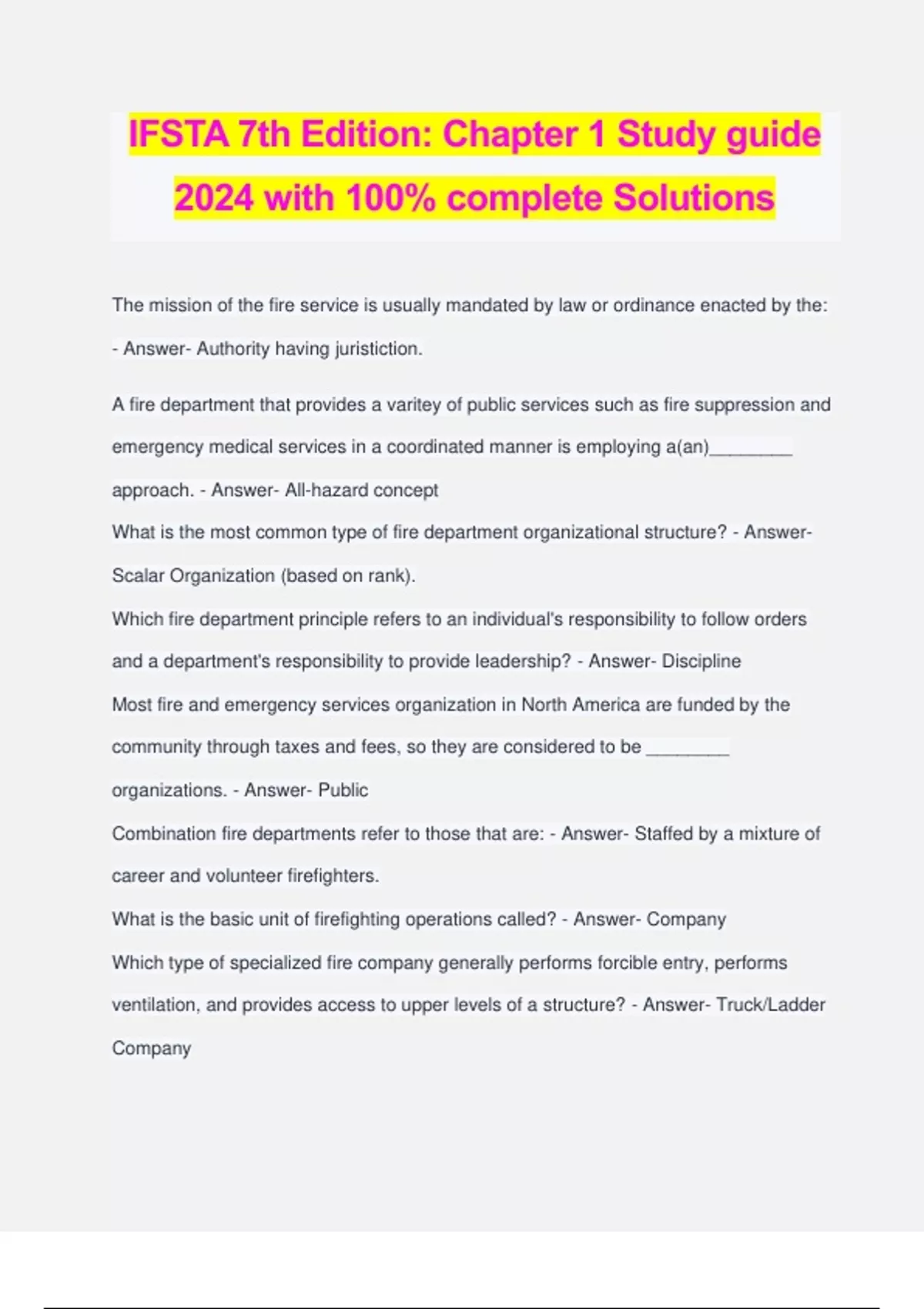 IFSTA 7th Edition: Chapter 1 Study guide 2024 with 100% complete Solutions The mission of the fire service is usually mandated by law or ordinance enacted by the: - Answer- Authority having juristiction. A fire department that provides a varitey of public services such as fire suppression and emergency medical services in a coordinated manner is employing a(an)________ approach. - Answer- All-hazard concept What is the most common type of fire department organizational structure? - Answer- Scalar Organization (based on rank). Which fire department principle refers to an individual's responsibility to follow orders and a department's responsibility to provide leadership? - Answer- Discipline Most fire and emergency services organization in North America are funded by the community through taxes and fees, so they are considered to be ________ organizations. - Answer- Public Combination fire departments refer to those that are: - Answer- Staffed by a mixture of career and volunteer firefighters. What is the basic unit of firefighting operations called? - Answer- Company Which type of specialized fire company generally performs forcible entry, performs ventilation, and provides access to upper levels of a structure? - Answer- Truck/Ladder Company Which type of specialized fire company is in charge of extinguishing ground cover or grass fires? - Answer- Brush Company Firefighters who work a required scheduled and receive pay and benefits for their work are referred to as: - Answer- Career firefighters The basic criteria for Fire fighter I competency and professionalism is established in: - Answer- NFPA 1001 Which individual or entity is in charge of setting, the age and educational requirements for employment at a fire department? - Answer- National Fire Protection Association (NFPA). Which statement accurately describes a difference in level of responsibilities and duties of a Fire Fighter I and Fire Fighter II? - Answer- Firefighter II may assume command within the Incident Command System, but a Firefighter I may not. Which type of fire service specialization includes personnel who are specifically certified to mitigate chemical, biological, radiological, nuclear, or explosive emergencies? - Answer- Hazardous materials technician Which type of fire officer is generally tasked with managing the fire prevention, plans review, and investigation division of a fire department? - Answer- Fire Marshal Which type of fire officer directly supervises a group of fire companies? - Answer- Battalion/District chief Which duty is the responsibility of the fire prevention division of a fire department? - Answer- Code enforcement and community risk reduction. Which individual oversees all training activities and supervises training division personnel? - Answer- Training officer