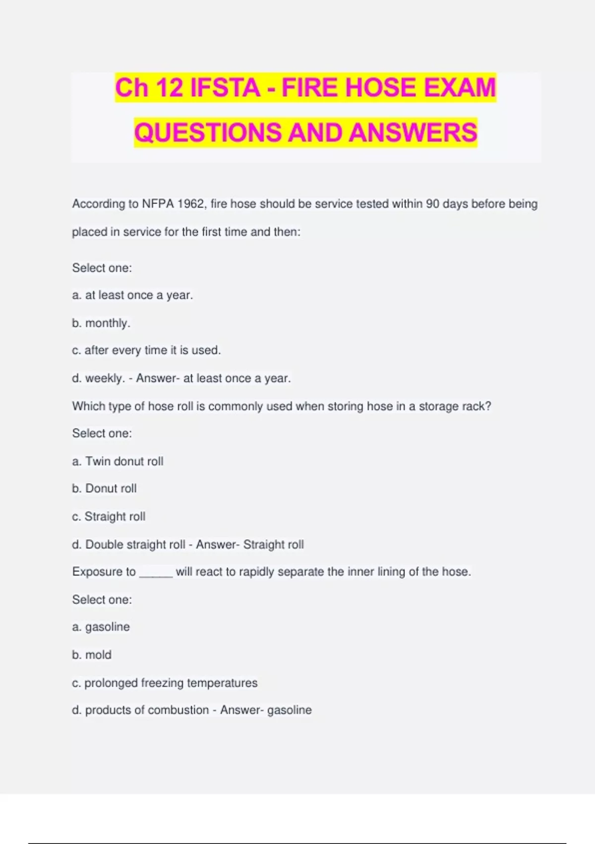 Ch 12 IFSTA - FIRE HOSE EXAM QUESTIONS AND ANSWERS According to NFPA 1962, fire hose should be service tested within 90 days before being placed in service for the first time and then: Select one: a. at least once a year. b. monthly. c. after every time it is used. d. weekly. - Answer- at least once a year. Which type of hose roll is commonly used when storing hose in a storage rack? Select one: a. Twin donut roll b. Donut roll c. Straight roll d. Double straight roll - Answer- Straight roll Exposure to _____ will react to rapidly separate the inner lining of the hose. Select one: a. gasoline b. mold c. prolonged freezing temperatures d. products of combustion - Answer- gasoline Which type of hose transports water from the pumping apparatus to the nozzle where it is applied to the fire? Select one: a. Large diameter hose b. Attack hose c. Supply hose d. Hard suction hose - Answer- Attack hose Which statement describes two-way couplings? Select one: a. No risk of connections coming undone b. Require adapters to connect two sections of hose c. Only used on attack hose d. Do not have male and female threads - Answer- Do not have male and female threads A male hose coupling: Select one: a. has the thread on the exterior. b. can only be connected to other male couplings. c. can be connected to a nonthreaded coupling without an adapter. d. has the thread on the interior. - Answer- has the thread on the exterior. When hose is rolled in a single section straight roll, the: Select one: a. female coupling is in the center of the roll. b. male coupling is in the center of the roll. c. roll is easily transported as part of a high-rise pack. d. roll is too large for one firefighter to carry alone. - Answer- male coupling is in the center of the roll. What is a disadvantage of the flat hose load? Select one: a. The hose is more likely to be damaged from apparatus vibration. b. It can only be used with small diameter hose. c. The hose folds contain sharp bends. d. It is the most difficult hose load to make. - Answer- The hose folds contain sharp bends. In order to make the process of loading large diameter hose (LDH) more efficient,: Select one: a. many apparatus are equipped with separate LDH hose beds. b. it should be loaded in just one side of a split hose bed. c. many apparatus are equipped with an LDH hose roller. d. it should always be loaded in a flat load. - Answer- many apparatus are equipped with an LDH hose roller. Corrosion can occur to fire hose couplings when: Select one: a. exposure to a substance weakens the metal over time. b. they are made from aluminum rather than brass. c. the metal freezes and is not immediately thawed. d. the couplings are dropped or dragged on the ground. - Answer- exposure to a substance weakens the metal over time