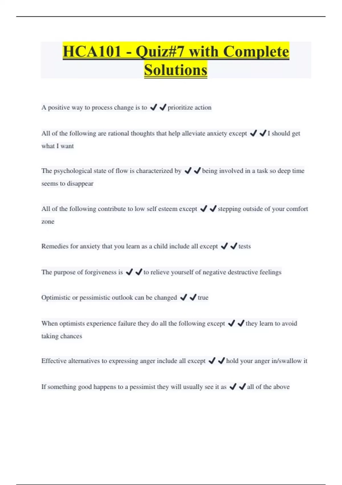 HCA101 - Quiz#7 with Complete Solutions A positive way to process change is to ️️prioritize action All of the following are rational thoughts that help alleviate anxiety except ️️I should get what I want The psychological state of flow is characterized by ️️being involved in a task so deep time seems to disappear All of the following contribute to low self esteem except ️️stepping outside of your comfort zone Remedies for anxiety that you learn as a child include all except ️️tests The purpose of forgiveness is ️️to relieve yourself of negative destructive feelings Optimistic or pessimistic outlook can be changed ️️true When optimists experience failure they do all the following except ️️they learn to avoid taking chances Effective alternatives to expressing anger include all except ️️hold your anger in/swallow it If something good happens to a pessimist they will usually see it as ️️all of the above