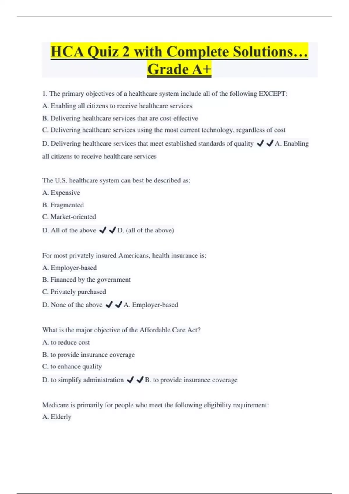 HCA Quiz 2 with Complete Solutions… Grade A+ 1. The primary objectives of a healthcare system include all of the following EXCEPT: A. Enabling all citizens to receive healthcare services B. Delivering healthcare services that are cost-effective C. Delivering healthcare services using the most current technology, regardless of cost D. Delivering healthcare services that meet established standards of quality ️️A. Enabling all citizens to receive healthcare services The U.S. healthcare system can best be described as: A. Expensive B. Fragmented C. Market-oriented D. All of the above ️️D. (all of the above) For most privately insured Americans, health insurance is: A. Employer-based B. Financed by the government C. Privately purchased D. None of the above ️️A. Employer-based
