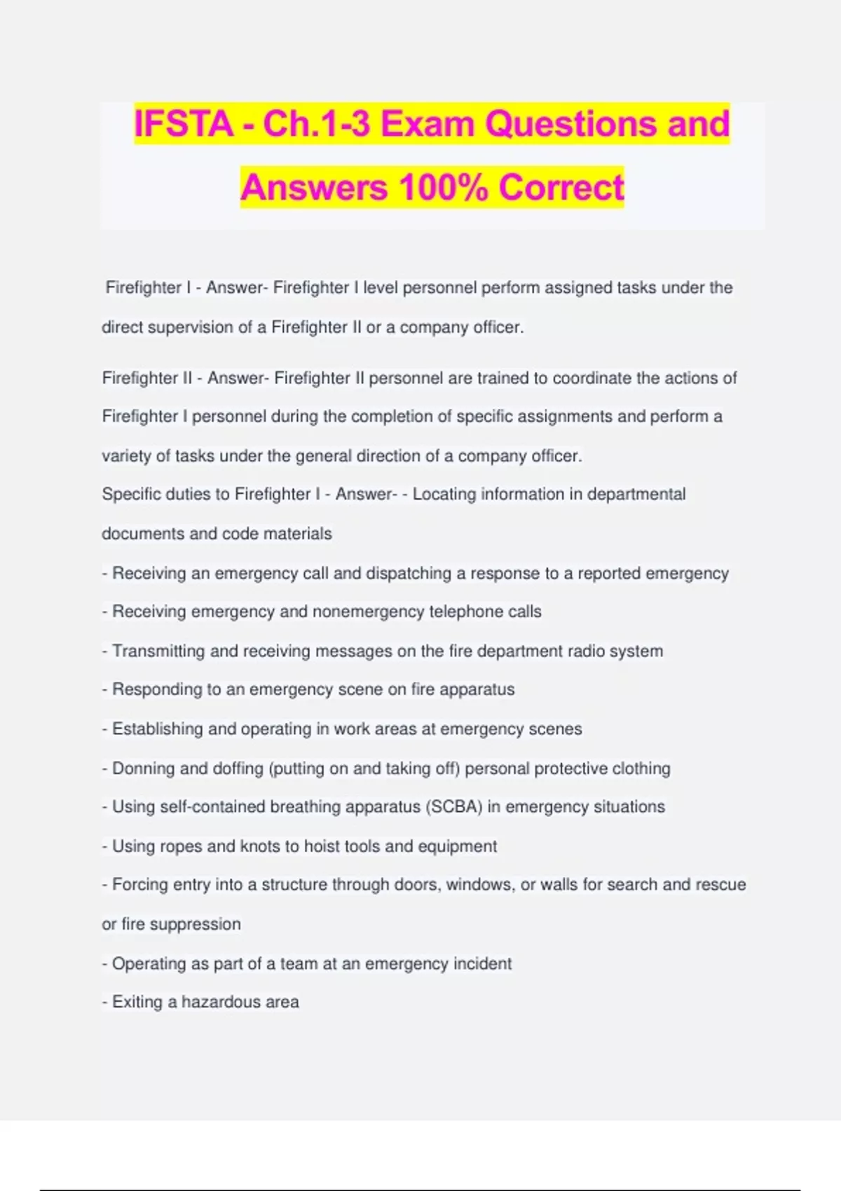 IFSTA - Ch.1-3 Exam Questions and Answers 100% Correct Firefighter I - Answer- Firefighter I level personnel perform assigned tasks under the direct supervision of a Firefighter II or a company officer. Firefighter II - Answer- Firefighter II personnel are trained to coordinate the actions of Firefighter I personnel during the completion of specific assignments and perform a variety of tasks under the general direction of a company officer. Specific duties to Firefighter I - Answer- - Locating information in departmental documents and code materials - Receiving an emergency call and dispatching a response to a reported emergency - Receiving emergency and nonemergency telephone calls - Transmitting and receiving messages on the fire department radio system - Responding to an emergency scene on fire apparatus - Establishing and operating in work areas at emergency scenes - Donning and doffing (putting on and taking off) personal protective clothing - Using self-contained breathing apparatus (SCBA) in emergency situations - Using ropes and knots to hoist tools and equipment - Forcing entry into a structure through doors, windows, or walls for search and rescue or fire suppression - Operating as part of a team at an emergency incident - Exiting a hazardous area - Setting up and using ground ladders - Attacking a vehicle fire - Extinguishing fires in exterior Class A materials - Conducting a search and rescue in a structure as part of a team - Attacking an interior structure fire as part of a team - Performing horizontal and vertical ventilation on a structure as part of a team - Performing overhaul activities at a fire scene - Performing salvage activities to conserve property - Connecting a fire department pumper to a water supply - Using a portable fire extinguisher to extinguish incipient (early) Class A, B, and C fires - Using lights and portable generators to illuminate an emergency scene - Turning off building utilities - Combatting a ground cover fire - Operating, inspecting, cleaning, and maintaining ladders, ventilation equipment, SCBA, ropes, salvage equipment, and hand tools based on manufacturer's or departmental guidelines - Cleaning, inspecting, and returning fire hose to service Specific duties to Firefighter II - Answer- - Completing basic incident reports - Communicating the need for additional assistance at an incident - Extinguishing ignitable liquid fires using foam suppression concentrates and nozzles - Coordinating an interior attack line at a structure fire - Controlling flammable gas fires - Protecting evidence and determining fire cause and origin