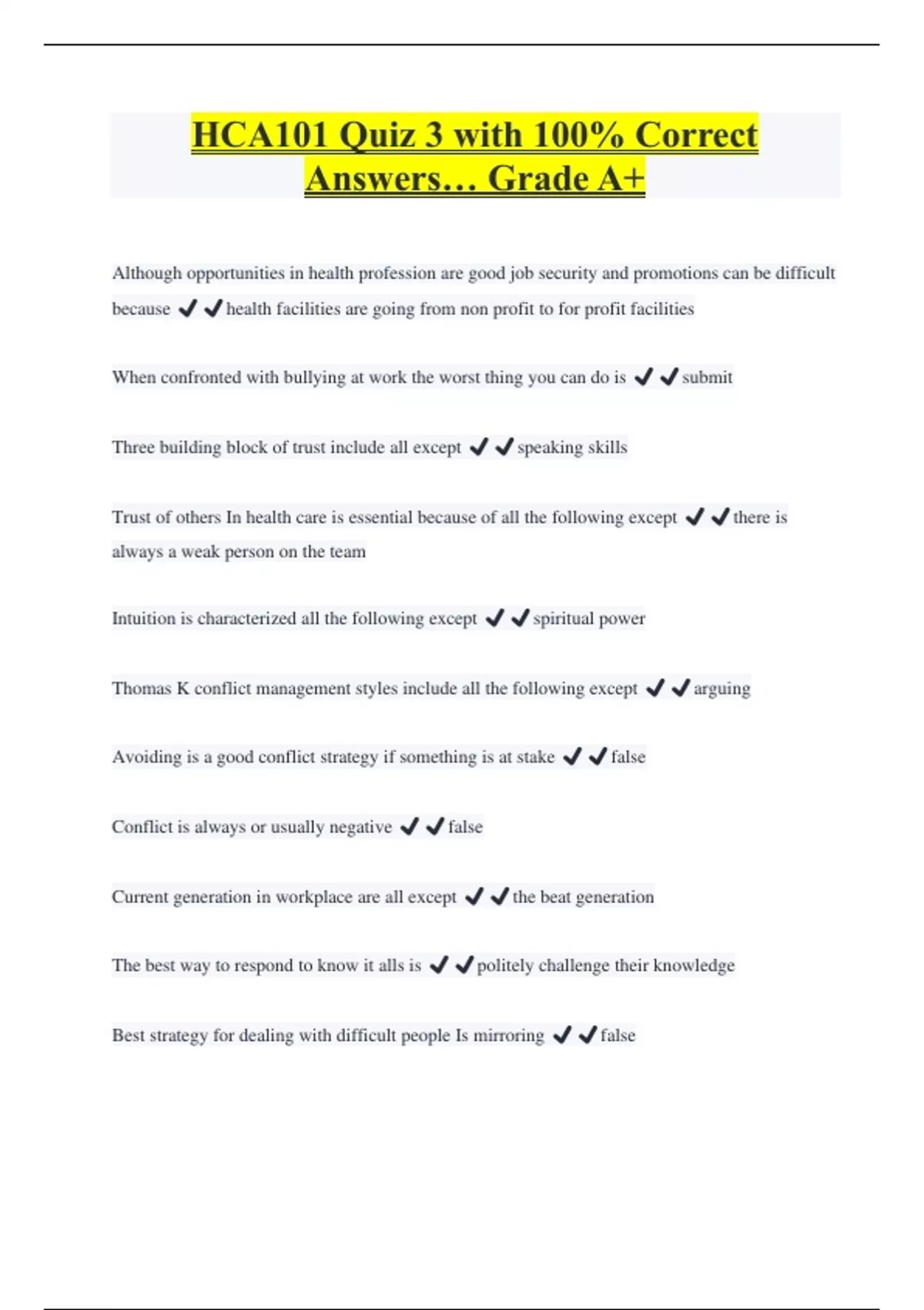 HCA101 Quiz 3 with 100% Correct Answers… Grade A+ Although opportunities in health profession are good job security and promotions can be difficult because ️️health facilities are going from non profit to for profit facilities When confronted with bullying at work the worst thing you can do is ️️submit Three building block of trust include all except ️️speaking skills Trust of others In health care is essential because of all the following except ️️there is always a weak person on the team Intuition is characterized all the following except ️️spiritual power Thomas K conflict management styles include all the following except ️️arguing Avoiding is a good conflict strategy if something is at stake ️️false Conflict is always or usually negative ️️false Current generation in workplace are all except ️️the beat generation The best way to respond to know it alls is ️️politely challenge their knowledge Best strategy for dealing with difficult people Is mirroring ️️false