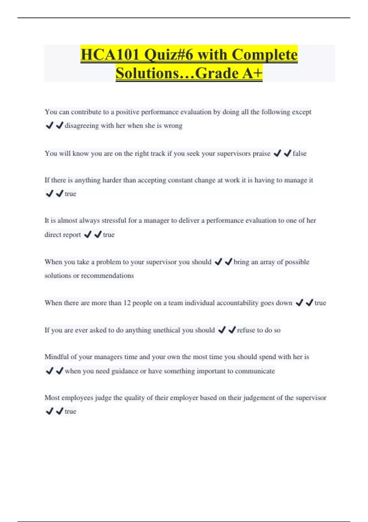 HCA101 Quiz#6 with Complete Solutions…Grade A+ You can contribute to a positive performance evaluation by doing all the following except ️️disagreeing with her when she is wrong You will know you are on the right track if you seek your supervisors praise ️️false If there is anything harder than accepting constant change at work it is having to manage it ️️true It is almost always stressful for a manager to deliver a performance evaluation to one of her direct report ️️true When you take a problem to your supervisor you should ️️bring an array of possible solutions or recommendations When there are more than 12 people on a team individual accountability goes down ️️true If you are ever asked to do anything unethical you should ️️refuse to do so Mindful of your managers time and your own the most time you should spend with her is ️️when you need guidance or have something important to communicate Most employees judge the quality of their employer based on their judgement of the supervisor ️️true