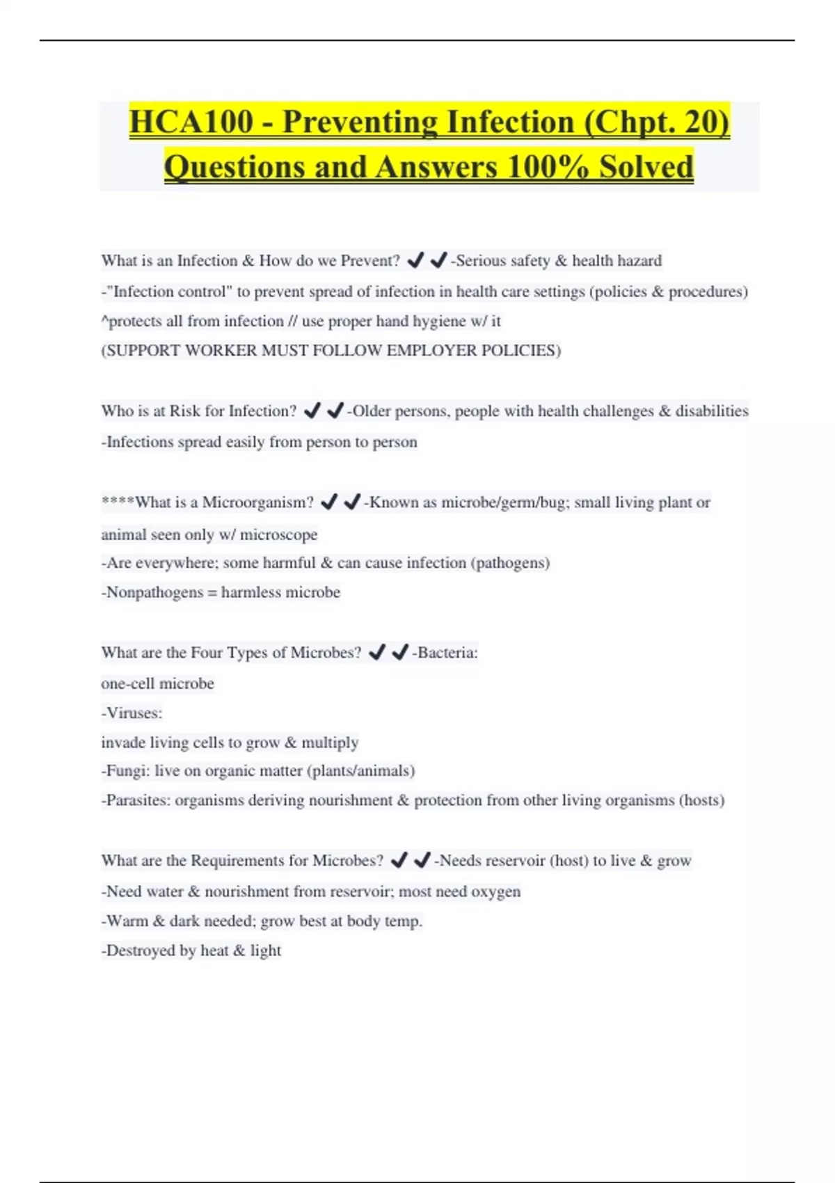 HCA100 - Preventing Infection (Chpt. 20) Questions and Answers 100% Solved What is an Infection & How do we Prevent? ️️-Serious safety & health hazard -"Infection control" to prevent spread of infection in health care settings (policies & procedures) ^protects all from infection // use proper hand hygiene w/ it (SUPPORT WORKER MUST FOLLOW EMPLOYER POLICIES) Who is at Risk for Infection? ️️-Older persons, people with health challenges & disabilities -Infections spread easily from person to person ****What is a Microorganism? ️️-Known as microbe/germ/bug; small living plant or animal seen only w/ microscope -Are everywhere; some harmful & can cause infection (pathogens) -Nonpathogens = harmless microbe What are the Four Types of Microbes? ️️-Bacteria: one-cell microbe -Viruses: invade living cells to grow & multiply -Fungi: live on organic matter (plants/animals) -Parasites: organisms deriving nourishment & protection from other living organisms (hosts) What are the Requirements for Microbes? ️️-Needs reservoir (host) to live & grow -Need water & nourishment from reservoir; most need oxygen -Warm & dark needed; grow best at body temp. -Destroyed by heat & light