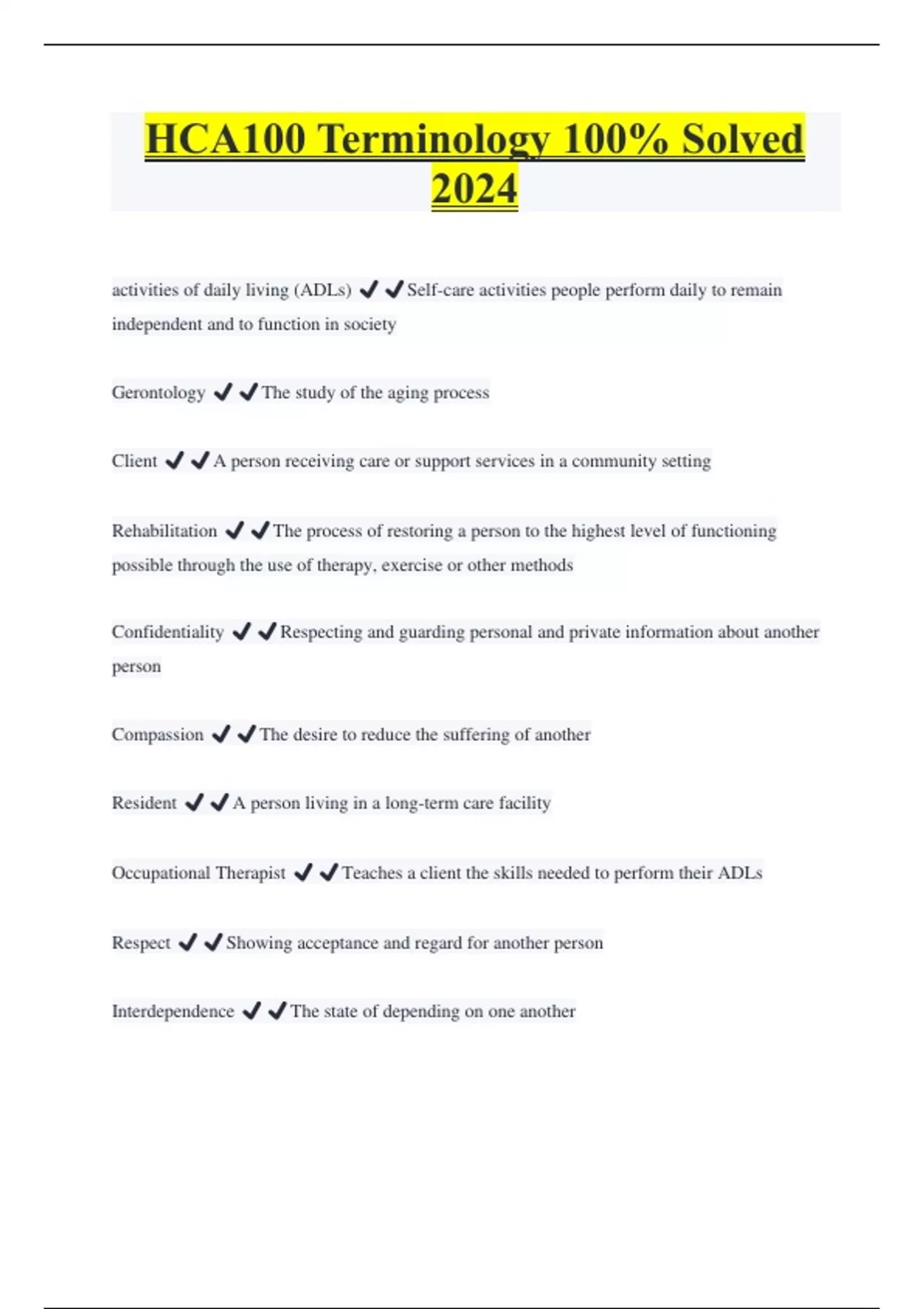 HCA100 Terminology 100% Solved 2024 activities of daily living (ADLs) ️️Self-care activities people perform daily to remain independent and to function in society Gerontology ️️The study of the aging process Client ️️A person receiving care or support services in a community setting Rehabilitation ️️The process of restoring a person to the highest level of functioning possible through the use of therapy, exercise or other methods Confidentiality ️️Respecting and guarding personal and private information about another person Compassion ️️The desire to reduce the suffering of another Resident ️️A person living in a long-term care facility Occupational Therapist ️️Teaches a client the skills needed to perform their ADLs Respect ️️Showing acceptance and regard for another person Interdependence ️️The state of depending on one another