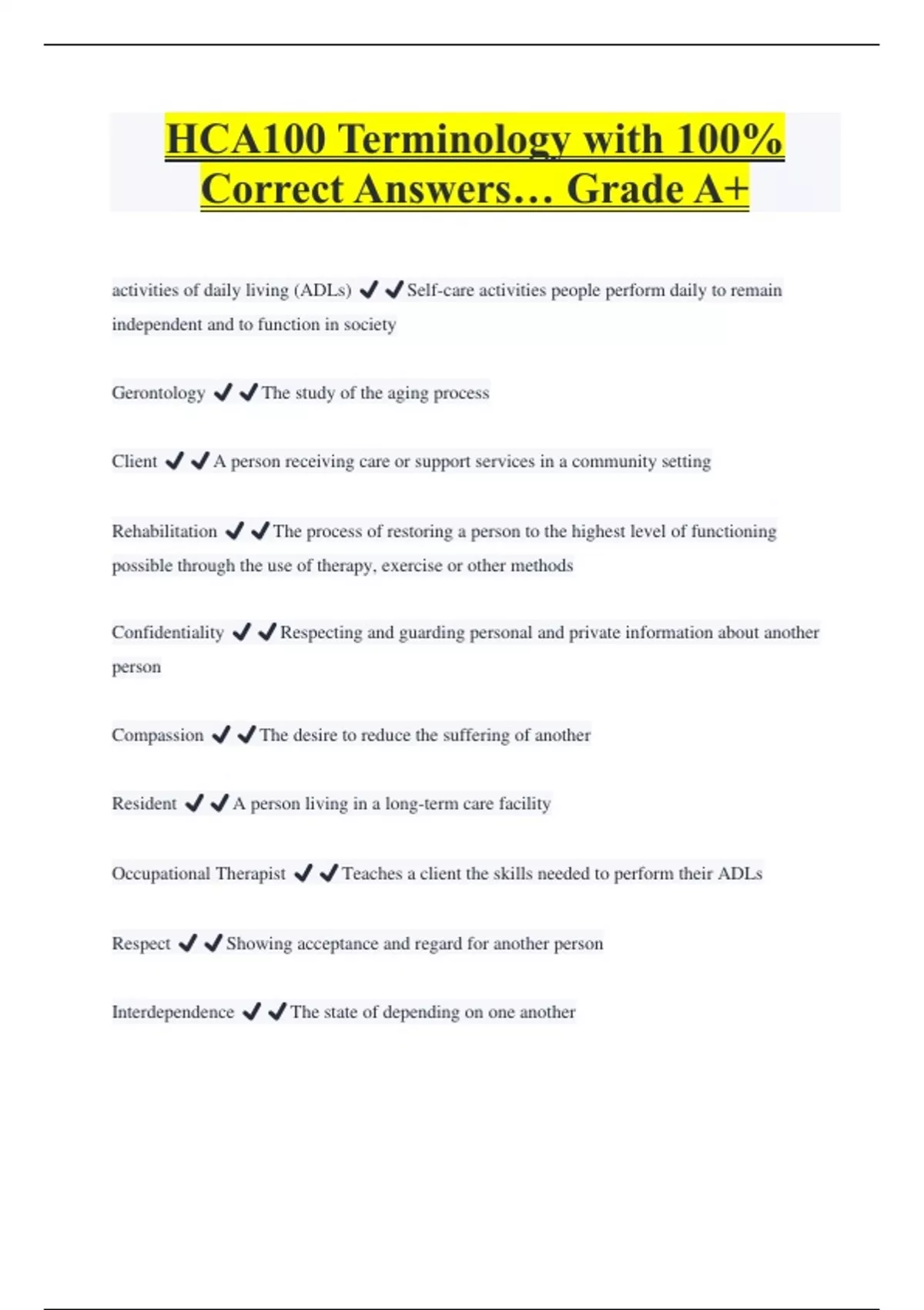 HCA100 Terminology with 100% Correct Answers… Grade A+ activities of daily living (ADLs) ️️Self-care activities people perform daily to remain independent and to function in society Gerontology ️️The study of the aging process Client ️️A person receiving care or support services in a community setting Rehabilitation ️️The process of restoring a person to the highest level of functioning possible through the use of therapy, exercise or other methods Confidentiality ️️Respecting and guarding personal and private information about another person Compassion ️️The desire to reduce the suffering of another Resident ️️A person living in a long-term care facility Occupational Therapist ️️Teaches a client the skills needed to perform their ADLs Respect ️️Showing acceptance and regard for another person Interdependence ️️The state of depending on one another