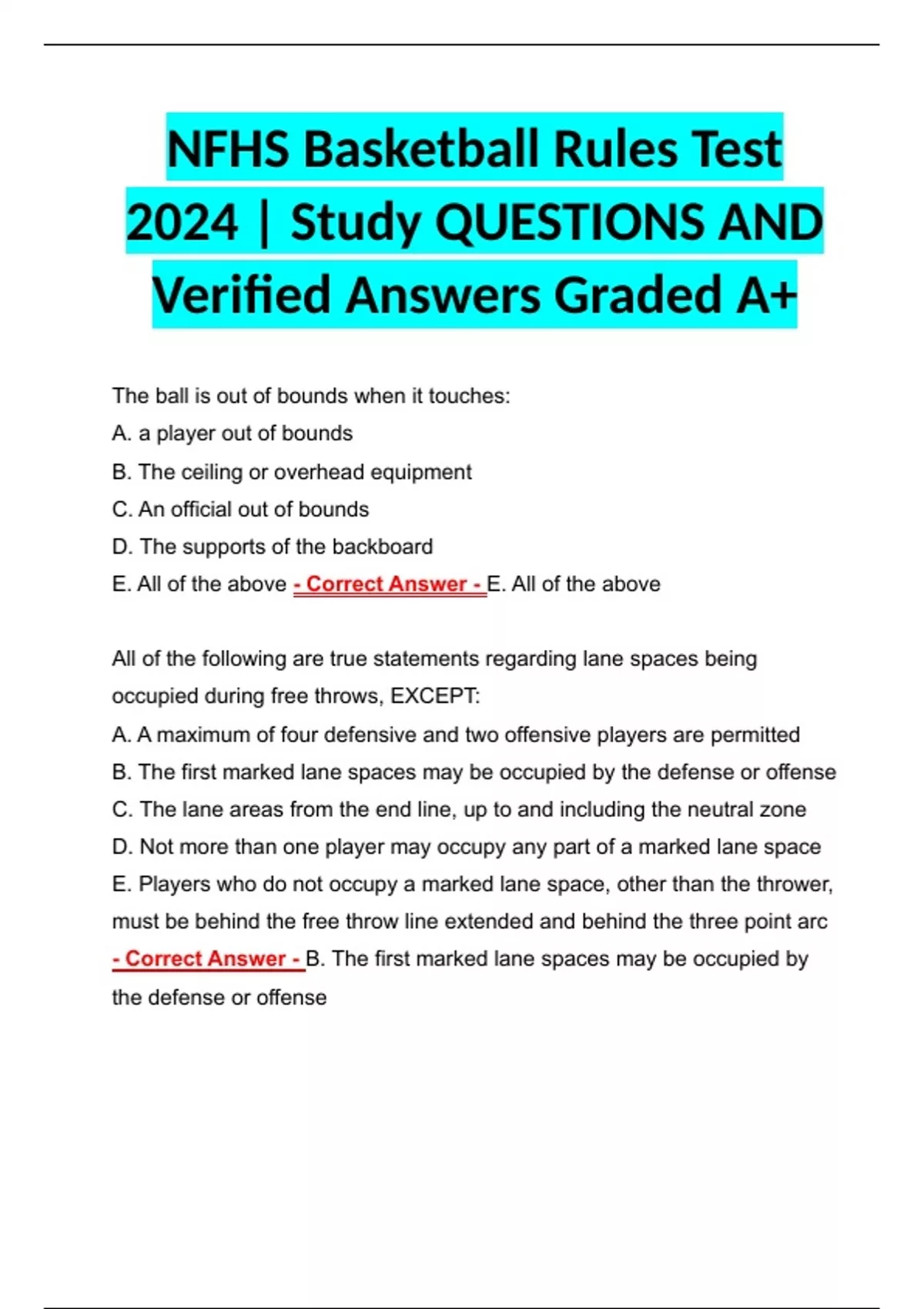 NFHS Basketball Rules Test 2024 | Study QUESTIONS AND Verified Answers Graded A+ NFHS Basketball Rules Test 2024 | Study QUESTIONS AND Verified Answers Graded A+ NFHS Basketball Rules Test 2024 | Study QUESTIONS AND Verified Answers Graded A+