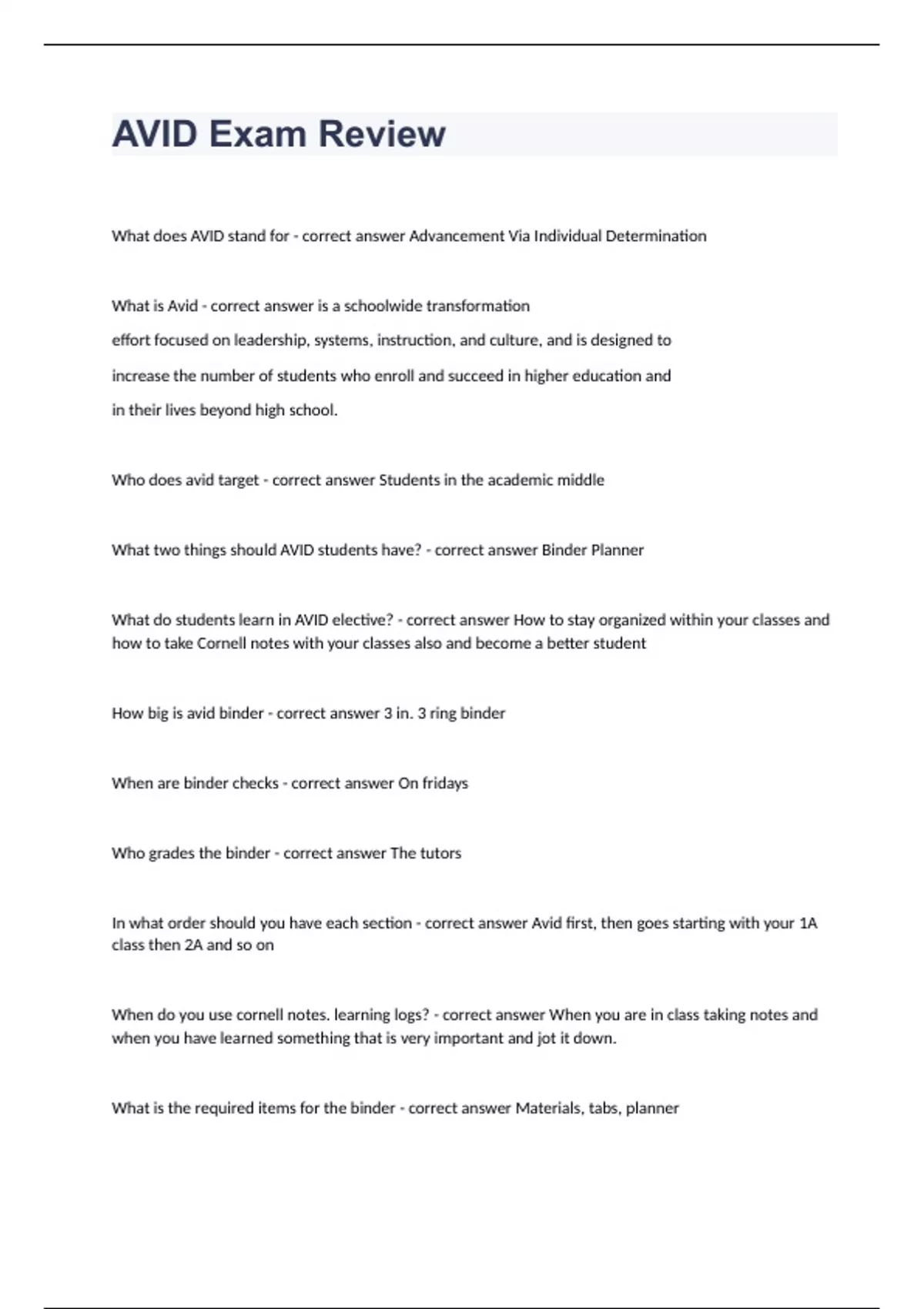 AVID Exam Review Practice Questions 2024. What does AVID stand for - correct answer Advancement Via Individual Determination What is Avid - correct answer is a schoolwide transformation effort focused on leadership, systems, instruction, and culture, and is designed to increase the number of students who enroll and succeed in higher education and in their lives beyond high school. Who does avid target - correct answer Students in the academic middle What two things should AVID students have? - correct answer Binder Planner What do students learn in AVID elective? - correct answer How to stay organized within your classes and how to take Cornell notes with your classes also and become a better student How big is avid binder - correct answer 3 in. 3 ring binder When are binder checks - correct answer On fridays Who grades the binder - correct answer The tutors In what order should you have each section - correct answer Avid first, then goes starting with your 1A class then 2A and so on