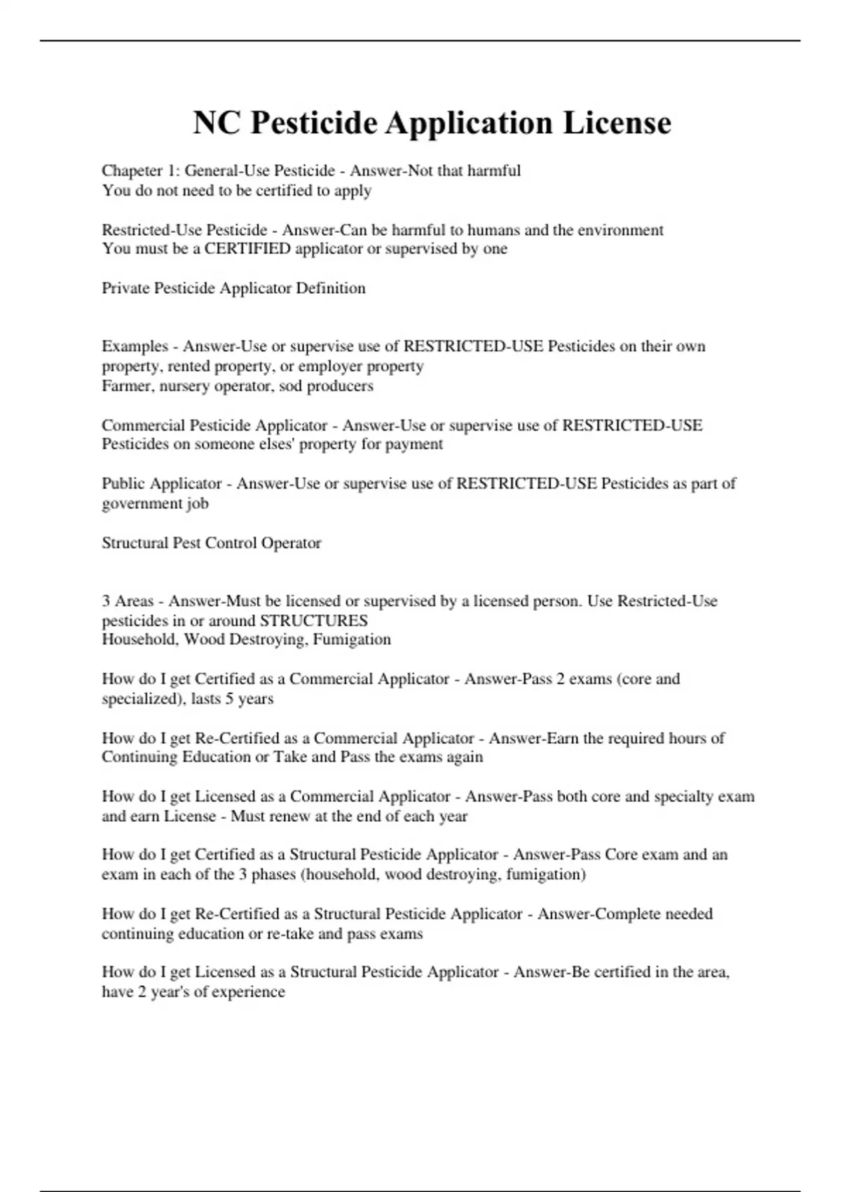 Chapeter 1: General-Use Pesticide - Answer-Not that harmful You do not need to be certified to apply Restricted-Use Pesticide - Answer-Can be harmful to humans and the environment You must be a CERTIFIED applicator or supervised by one Private Pesticide Applicator Definition Examples - Answer-Use or supervise use of RESTRICTED-USE Pesticides on their own property, rented property, or employer property Farmer, nursery operator, sod producers Commercial Pesticide Applicator - Answer-Use or supervise use of RESTRICTED-USE Pesticides on someone elses' property for payment Public Applicator - Answer-Use or supervise use of RESTRICTED-USE Pesticides as part of government job Structural Pest Control Operator 3 Areas - Answer-Must be licensed or supervised by a licensed person. Use Restricted-Use pesticides in or around STRUCTURES Household, Wood Destroying, Fumigation How do I get Certified as a Commercial Applicator - Answer-Pass 2 exams (core and specialized), lasts 5 years How do I get Re-Certified as a Commercial Applicator - Answer-Earn the required hours of Continuing Education or Take and Pass the exams again How do I get Licensed as a Commercial Applicator - Answer-Pass both core and specialty exam and earn License - Must renew at the end of each year How do I get Certified as a Structural Pesticide Applicator - Answer-Pass Core exam and an exam in each of the 3 phases (household, wood destroying, fumigation) How do I get Re-Certified as a Structural Pesticide Applicator - Answer-Complete needed continuing education or re-take and pass exams How do I get Licensed as a Structural Pesticide Applicator - Answer-Be certified in the area, have 2 year's of experience