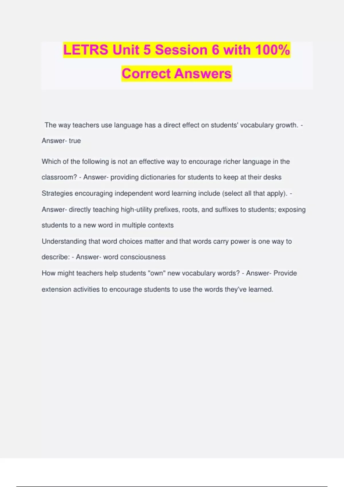 LETRS Unit 5 Session 6 with 100% Correct Answers The way teachers use language has a direct effect on students' vocabulary growth. - Answer- true Which of the following is not an effective way to encourage richer language in the classroom? - Answer- providing dictionaries for students to keep at their desks Strategies encouraging independent word learning include (select all that apply). -