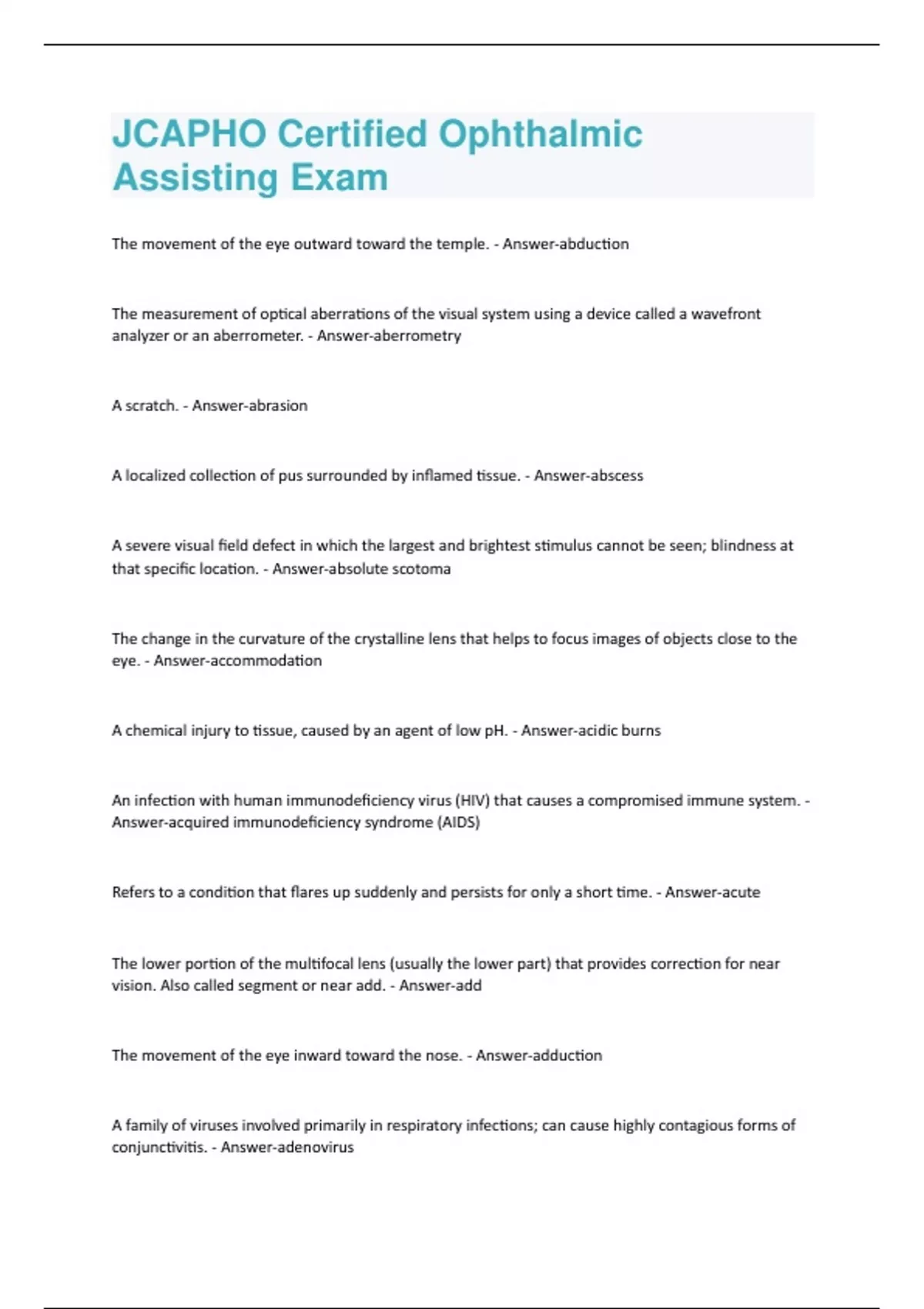 The movement of the eye outward toward the temple. - Answer-abduction The measurement of optical aberrations of the visual system using a device called a wavefront analyzer or an aberrometer. - Answer-aberrometry A scratch. - Answer-abrasion A localized collection of pus surrounded by inflamed tissue. - Answer-abscess A severe visual field defect in which the largest and brightest stimulus cannot be seen; blindness at that specific location. - Answer-absolute scotoma The change in the curvature of the crystalline lens that helps to focus images of objects close to the eye. - Answer-accommodation A chemical injury to tissue, caused by an agent of low pH. - Answer-acidic burns An infection with human immunodeficiency virus (HIV) that causes a compromised immune system. - Answer-acquired immunodeficiency syndrome (AIDS) Refers to a condition that flares up suddenly and persists for only a short time. - Answer-acute The lower portion of the multifocal lens (usually the lower part) that provides correction for near vision. Also called segment or near add. - Answer-add The movement of the eye inward toward the nose. - Answer-adduction A family of viruses involved primarily in respiratory infections; can cause highly contagious forms of conjunctivitis. - Answer-adenovirusThe tissues and structures surrounding the eye; includes the orbit, extraocular muscles, eyelids, and lacrimal apparatus. - Answer-adnexa A pupil with normal iris function that fails to constrict normally with direct light stimulation but reacts strongly consensually, or when the fellow eye is stimulated. Usually secondary to optic nerve disease. - Answer-afferent pupillary defect (APD) The retinoscopic reflex movement that is in the opposite direction from the movement of the streak of light from the retinoscope; typical of the myopic eye. - Answer-"against motion" A disease in which sensory cells of the macula degenerate, resulting in a loss of central vision; usually affects older people. - Answer-age-related macular degeneration A chemical injury to tissue, caused by an agent of high pH. - Answer-alkali burn A condition in which the body produces antibodies to foreign materials such as food, plant pollens, or medications. - Answer-allergic reaction A test performed by placing an occluder over one eye and then moving it slowly over to the other eye to detect a tendency for the eyes to deviate while under the occluder (such an ocular misalignment is known as a phoria). Also called cross-cover test. - Answer-alternate cover test The joining and enlargement of a nasal step visual field defect and an arcuate scooter to cause loss of the entire upper or lower visual field. - Answer-altitudinal scotoma Decreased vision present without apparent abnormalities in the ocular anatomy and uncorrectable by spectacles or contact lenses; results from visual deprivation in early childhood. - Answeramblyopia The refractive state of an eye that is unable to focus correctly due to a refractive error. - Answerametropia A test for determining the presence and location of defects in the central portion of the visual field. - Answer-Amsler grid test The structure of an organism. - Answer-anatomyA drug that causes a temporary deadening of a nerve, resulting in loss of feeling in the surrounding tissue. - Answer-anesthetic The formation of new blood vessels - Answer-angiogenesis A method of examining and recording size, structure, and location of blood vessels in organ systems, using fluorescent dyes. - Answer-angiography A condition in which the pupils are of unequal size. - Answer-anisocoria The front part of a structure. - Answer-anterior The junction of the cornea and the iris, from which aqueous humor leaves the eye. Also called filtration angle. - Answer-anterior chamber angle The small compartment between the cornea and the iris that is filled with a clear, transparent fluid called aqueous humor. - Answer-anterior chamber Insufficient blood flow to the optic nerve head resulting in a lack of oxygen and subsequent infarction of (loss of) the nerve fibers and loss of vision. - Answer-anterior ischemic optic neuropathy (AION) The front of the eye; includes the structures between the front surface of the cornea and the vitreous. - Answer-anterior segment A process or agent that prevents new blood vessel growth. - Answer-anti-angiogenesis A drug that combats a bacterial infection. - Answer-antibiotic A chemical substance that the body manufactures to neutralize an infecting microorganism, toxin, or foreign agent. - Answer-antibody
