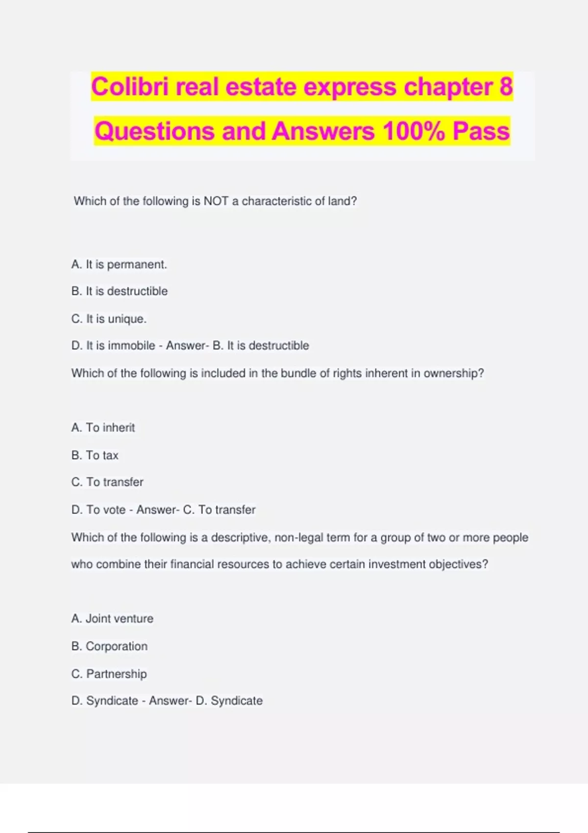 Colibri real estate express chapter 8 Questions and Answers 100% Pass Which of the following is NOT a characteristic of land? A. It is permanent. B. It is destructible C. It is unique. D. It is immobile - Answer- B. It is destructible Which of the following is included in the bundle of rights inherent in ownership? A. To inherit B. To tax C. To transfer D. To vote - Answer- C. To transfer Which of the following is a descriptive, non-legal term for a group of two or more people who combine their financial resources to achieve certain investment objectives? A. Joint venture B. Corporation C. Partnership D. Syndicate - Answer- D. Syndicate If an owner wants an antique chandelier to remain personal property, what must he or she do? A. Have the intention of removing it when he or she sells the home B. Never install it permanently C. List it as a personal item when the property sells D. Any of the above - Answer- D. Any of the above Subsurface rights extend A. to the center of the earth. B. to the water table. C. two feet below the surface. D.six inches below the surface. - Answer- A. to the center of the earth. The right to encumber property means the right to A. subdivide the property. B. drill/mine for minerals. C. build a structure on the property. D. mortgage the property as collateral for debt. - Answer- D. mortgage the property as collateral for debt. Rights of survivorship A. allows the court to auction off all property and split the funds among all survivors. B. allows all creditors to seek any damages and claims from the heirs. C. means that if a joint tenant dies, all interests and rights pass to the surviving joint tenants free from any claims of creditors or heirs. D. means that all rights pass to a trust fund account. - Answer- C. means that if a joint tenant dies, all interests and rights pass to the surviving joint tenants free from any claims of creditors or heirs. Which of the following would be intangible property? A. RV B. Boats C. Check book D. Furniture - Answer- C. Check book Littoral rights include A. the ownership of land under the water surface. B. land ownership up to the low-water mark. C. land ownership up to the high-water mark. D. ownership of water rights. - Answer- C. land ownership up to the high-water mark. Brothers Jim and Frank jointly hold a parcel of land. The property is held in A. severalty. B. co-ownership. C. trust. D. probate. - Answer- B. co-ownership. If the right to use the land is included in the bundle of rights, which of the following is not included in that right to use? A. Mining B. Building structures C. Infringing on neighbors D. Cultivating - Answer- C. Infringing on neighbors What is another term for fee simple? A. Conditional Fee B. Life Tenant C. Fee Interest D. Fee Basic - Answer- C. Fee Interest A tract of land A. has buildings attached. B. cannot be subdivided. C. is defined by boundaries. D. is not defined by boundaries. - Answer- C. is defined by boundaries. Which of the following best describes personal property? A. Is readily moveable from one location to another B. Is not readily moveable from one location to another C. Is attached to the ground D. Is transferred by title or deed - Answer- A. Is readily moveable from one location to another Which of the following is NOT an act of waste? A. Neglecting to pay property taxes B. Causing a fire that destroys the home C. Using the property for something other than was intended D. Maintaining landscape features - Answer- D. Maintaining landscape features Which of the following terms refers to the rights of a property that abuts a stream or river? A. Allodial B. Alluvial C. Littoral D. Riparian - Answer- D. Riparian Which of the following is NOT a characteristic of an estate in common? A. Unequal rights B. Identical rights C. No survivorship D. Two or more owners - Answer- A. Unequal rights Tenancy in common allows for