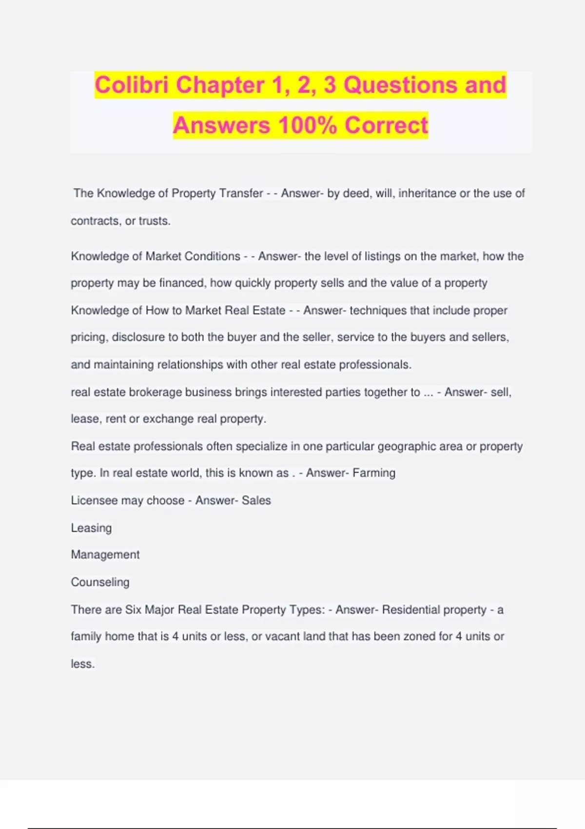 Colibri Chapter 1, 2, 3 Questions and Answers 100% Correct The Knowledge of Property Transfer - - Answer- by deed, will, inheritance or the use of contracts, or trusts. Knowledge of Market Conditions - - Answer- the level of listings on the market, how the property may be financed, how quickly property sells and the value of a property Knowledge of How to Market Real Estate - - Answer- techniques that include proper pricing, disclosure to both the buyer and the seller, service to the buyers and sellers, and maintaining relationships with other real estate professionals. real estate brokerage business brings interested parties together to ... - Answer- sell, lease, rent or exchange real property. Real estate professionals often specialize in one particular geographic area or property type. In real estate world, this is known as . - Answer- Farming Licensee may choose - Answer- Sales Leasing Management Counseling There are Six Major Real Estate Property Types: - Answer- Residential property - a family home that is 4 units or less, or vacant land that has been zoned for 4 units or less. Commercial property - income producing property - retail center or an apartment (4+ units) Industrial property - usually manufactures or distributes products Agricultural property - a farm or ranch land 10+ acres