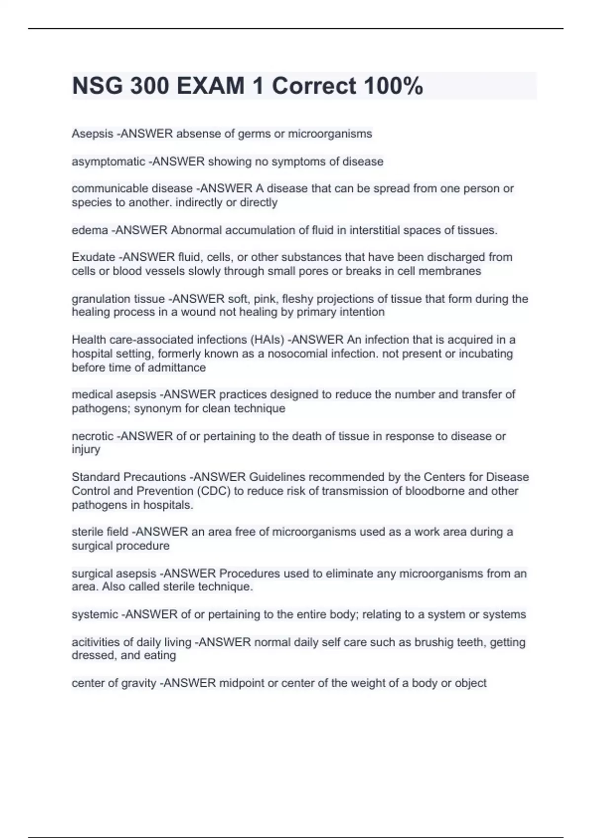 Asepsis -ANSWER absense of germs or microorganisms asymptomatic -ANSWER showing no symptoms of disease communicable disease -ANSWER A disease that can be spread from one person or species to another. indirectly or directly edema -ANSWER Abnormal accumulation of fluid in interstitial spaces of tissues. Exudate -ANSWER fluid, cells, or other substances that have been discharged from cells or blood vessels slowly through small pores or breaks in cell membranes granulation tissue -ANSWER soft, pink, fleshy projections of tissue that form during the healing process in a wound not healing by primary intention Health care-associated infections (HAIs) -ANSWER An infection that is acquired in a hospital setting, formerly known as a nosocomial infection. not present or incubating before time of admittance medical asepsis -ANSWER practices designed to reduce the number and transfer of pathogens; synonym for clean technique necrotic -ANSWER of or pertaining to the death of tissue in response to disease or injury Standard Precautions -ANSWER Guidelines recommended by the Centers for Disease Control and Prevention (CDC) to reduce risk of transmission of bloodborne and other pathogens in hospitals. sterile field -ANSWER an area free of microorganisms used as a work area during a surgical procedure surgical asepsis -ANSWER Procedures used to eliminate any microorganisms from an area. Also called sterile technique. systemic -ANSWER of or pertaining to the entire body; relating to a system or systems acitivities of daily living -ANSWER normal daily self care such as brushig teeth, getting dressed, and eating center of gravity -ANSWER midpoint or center of the weight of a body or object