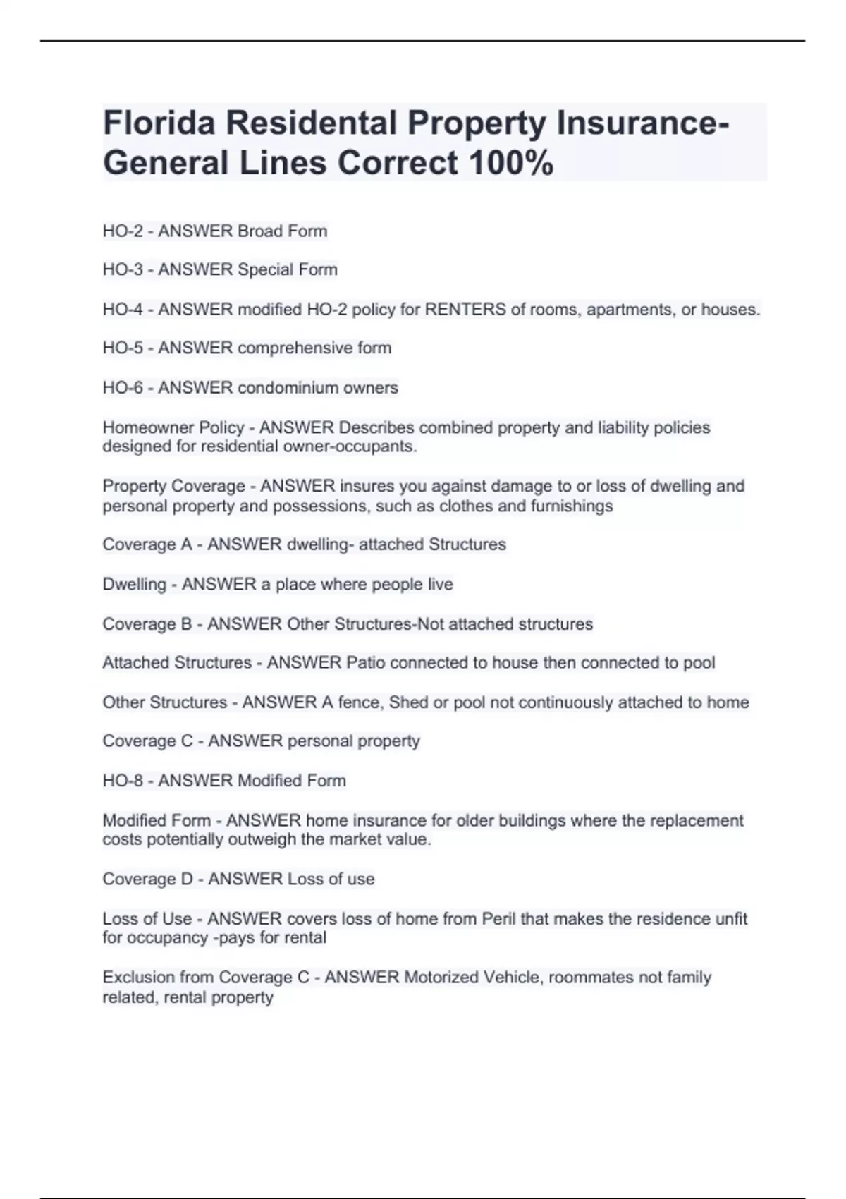 HO-3 - ANSWER HO-2 - ANSWER Broad Form Special Form HO-4 - ANSWER modified HO-2 policy for RENTERS of rooms, apartments, or houses. HO-5 - ANSWER comprehensive form HO-6 - ANSWER condominium owners Homeowner Policy - ANSWER Describes combined property and liability policies designed for residential owner-occupants. Property Coverage - ANSWER insures you against damage to or loss of dwelling and personal property and possessions, such as clothes and furnishings Coverage A - ANSWER dwelling- attached Structures Dwelling - ANSWER a place where people live Coverage B - ANSWER Other Structures-Not attached structures Attached Structures - ANSWER Patio connected to house then connected to pool Other Structures - ANSWER A fence, Shed or pool not continuously attached to home Coverage C - ANSWER personal property