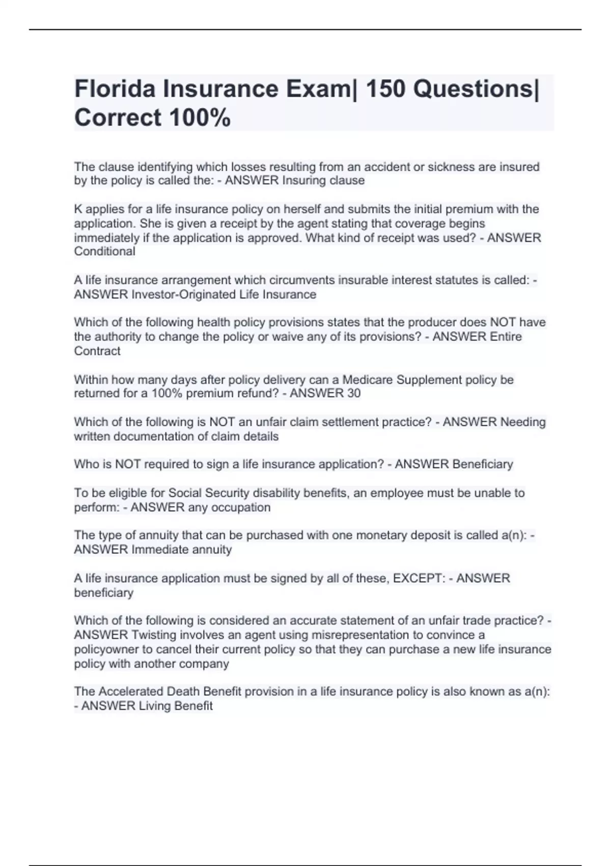 Florida Insurance Exam| 150 Questions| Correct 100%
