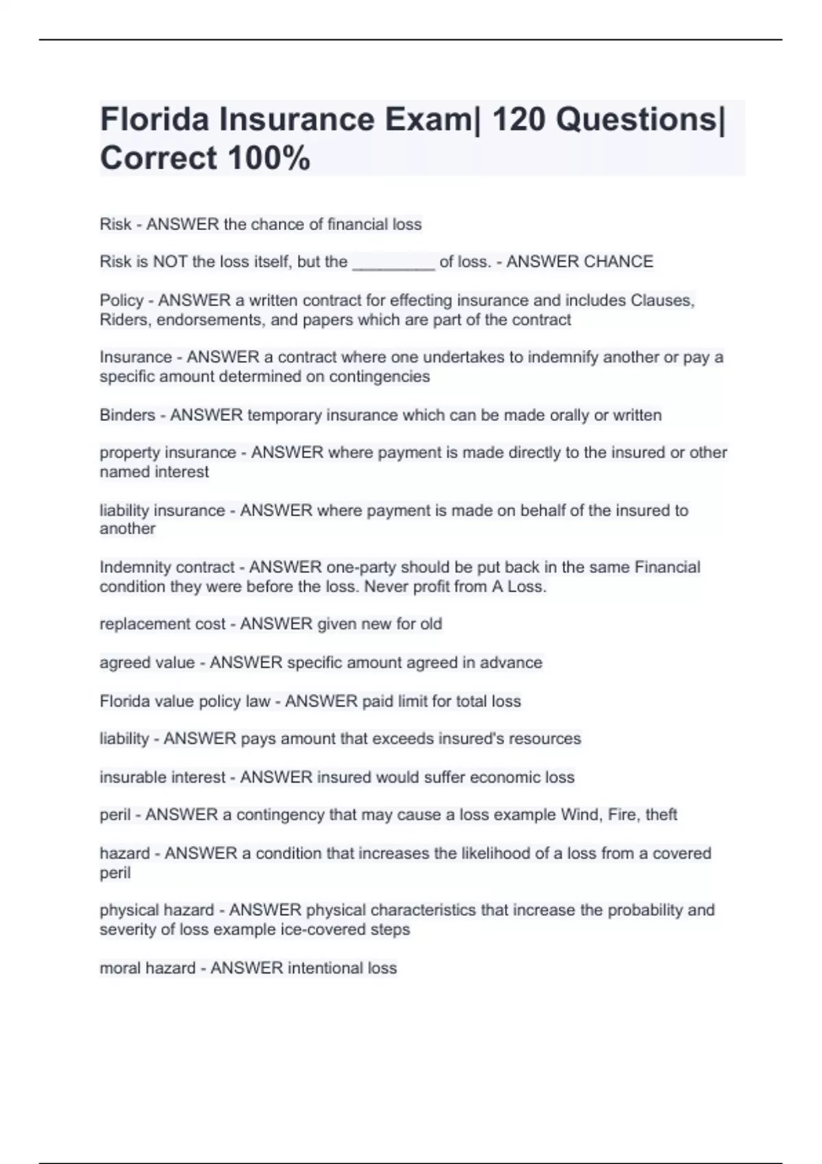 Florida Insurance Exam| 120 Questions| Correct 100%