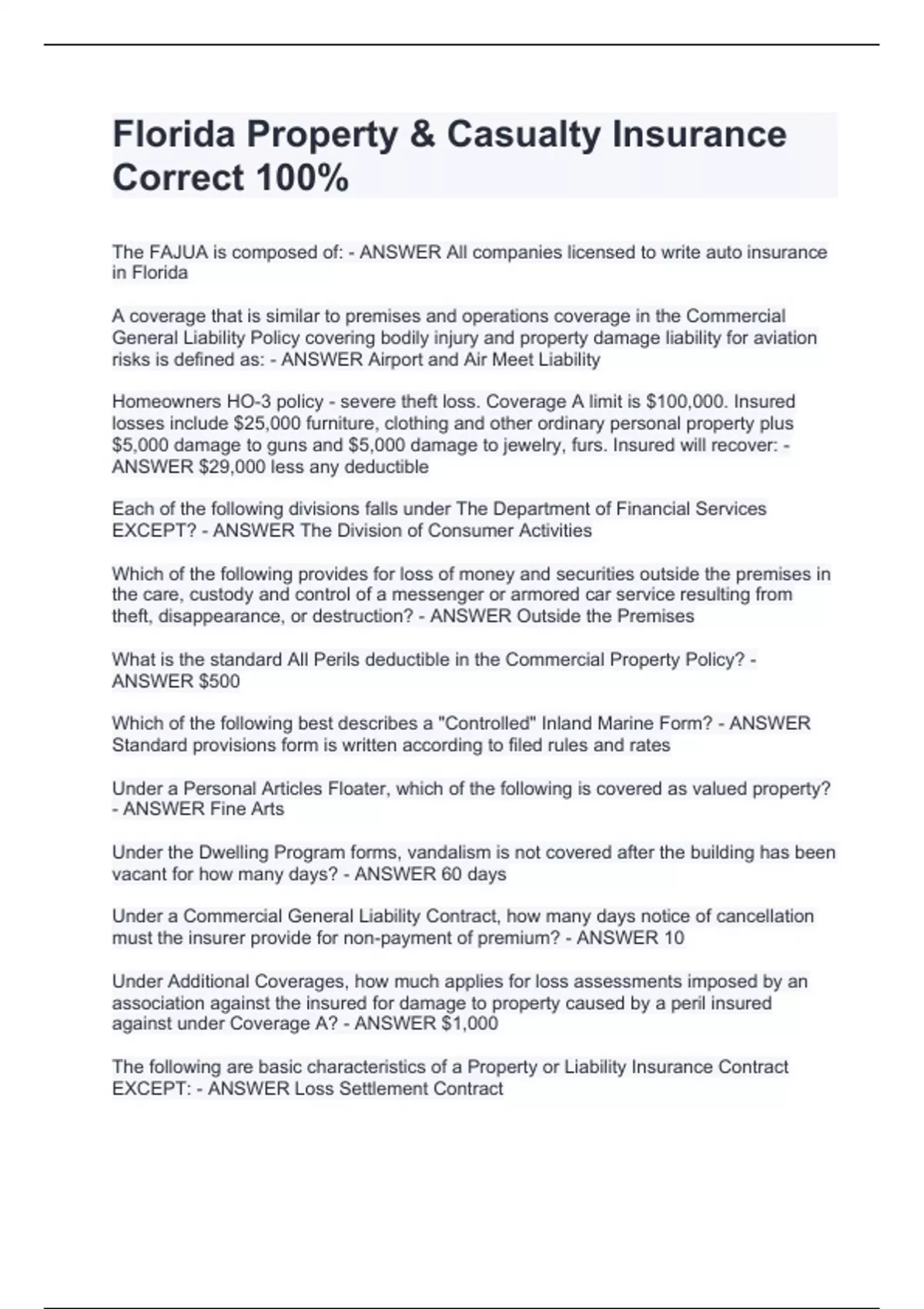 The FAJUA is composed of: - ANSWER All companies licensed to write auto insurance in Florida A coverage that is similar to premises and operations coverage in the Commercial General Liability Policy covering bodily injury and property damage liability for aviation risks is defined as: - ANSWER Airport and Air Meet Liability Homeowners HO-3 policy - severe theft loss. Coverage A limit is $100,000. Insured losses include $25,000 furniture, clothing and other ordinary personal property plus $5,000 damage to guns and $5,000 damage to jewelry, furs. Insured will recover: - ANSWER $29,000 less any deductible Each of the following divisions falls under The Department of Financial Services EXCEPT? - ANSWER The Division of Consumer Activities Which of the following provides for loss of money and securities outside the premises in the care, custody and control of a messenger or armored car service resulting from theft, disappearance, or destruction? - ANSWER Outside the Premises What is the standard All Perils deductible in the Commercial Property Policy? - ANSWER $500 Which of the following best describes a "Controlled" Inland Marine Form? - ANSWER Standard provisions form is written according to filed rules and rates Under a Personal Articles Floater, which of the following is covered as valued property? - ANSWER Fine Arts Under the Dwelling Program forms, vandalism is not covered after the building has been vacant for how many days? - ANSWER 60 days Under a Commercial General Liability Contract, how many days notice of cancellation must the insurer provide for non-payment of premium? - ANSWER 10 Under Additional Coverages, how much applies for loss assessments imposed by an association against the insured for damage to prop