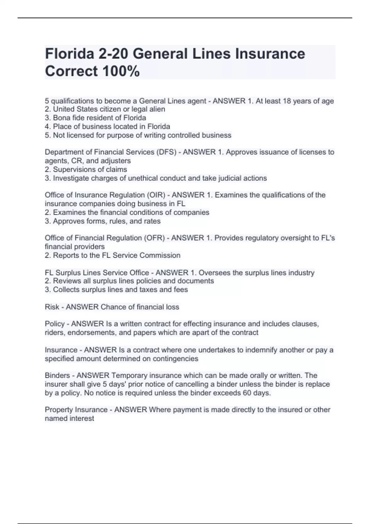 Florida 2-20 General Lines Insurance Correct 100%