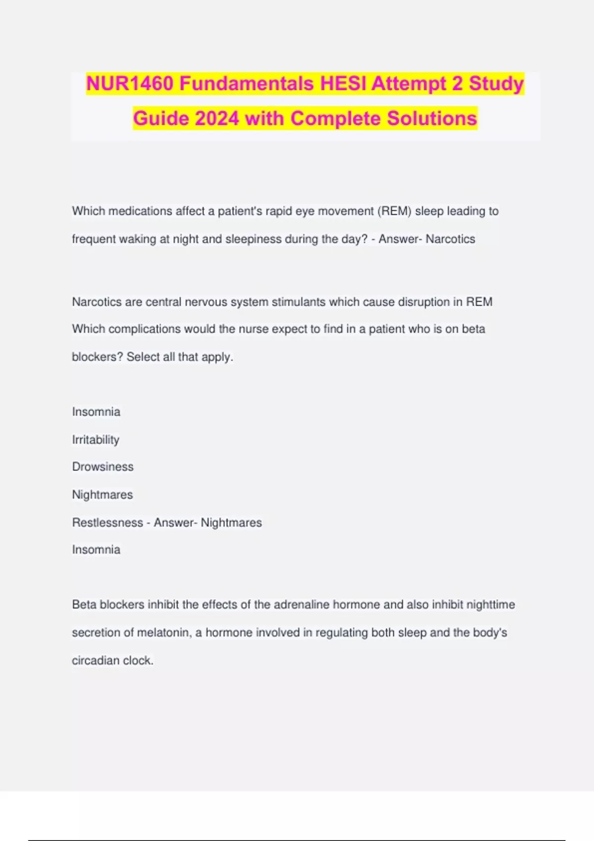 NUR1460 Fundamentals HESI Attempt 2 Study Guide 2024 with Complete Solutions Which medications affect a patient's rapid eye movement (REM) sleep leading to frequent waking at night and sleepiness during the day? - Answer- Narcotics Narcotics are central nervous system stimulants which cause disruption in REM Which complications would the nurse expect to find in a patient who is on beta blockers? Select all that apply. Insomnia Irritability Drowsiness Nightmares Restlessness - Answer- Nightmares Insomnia Beta blockers inhibit the effects of the adrenaline hormone and also inhibit nighttime secretion of melatonin, a hormone involved in regulating both sleep and the body's circadian clock. Which order should the nurse follow when removing personal protective equipment following a surgical procedure? Gloves, eyewear, gown, mask Mask, gown, eyewear, gloves Eyewear, gloves, gown, mask Gown, mask, eyewear, gloves - Answer- Gloves, eyewear, gown, mask Which term is defined as a global set of concepts which describe the central phenomena of the discipline and explains the relationship between those concepts? - Answer- Metaparadigm Which surgeries require general anesthesia? Select all that apply. Mastectomy Nephrectomy Breast biopsy Bowel resection Cataract surgery - Answer- Mastectomy Nephrectomy Bowel Resection Major surgeries require general anesthesia, and minor surgeries need local anesthesia. Which risks would the nurse anticipate in patients with a high red blood cell count (RBC), hemoglobin (Hgb), and hematocrit (Hct)? Select all that apply. Hemorrhage Renal disease Polycythemia vera Congenital heart disease Bone marrow suppression - Answer- Polycythemia vera Congenital heart disease Polycythemia vera is a bone marrow disorder that results in an increased number of RBCs With an elevated RBC count, the patient will also have an increase in Hgb and Hct. A patient with congenital heart disease may also have an increase in RBCs, Hgb, and Hct