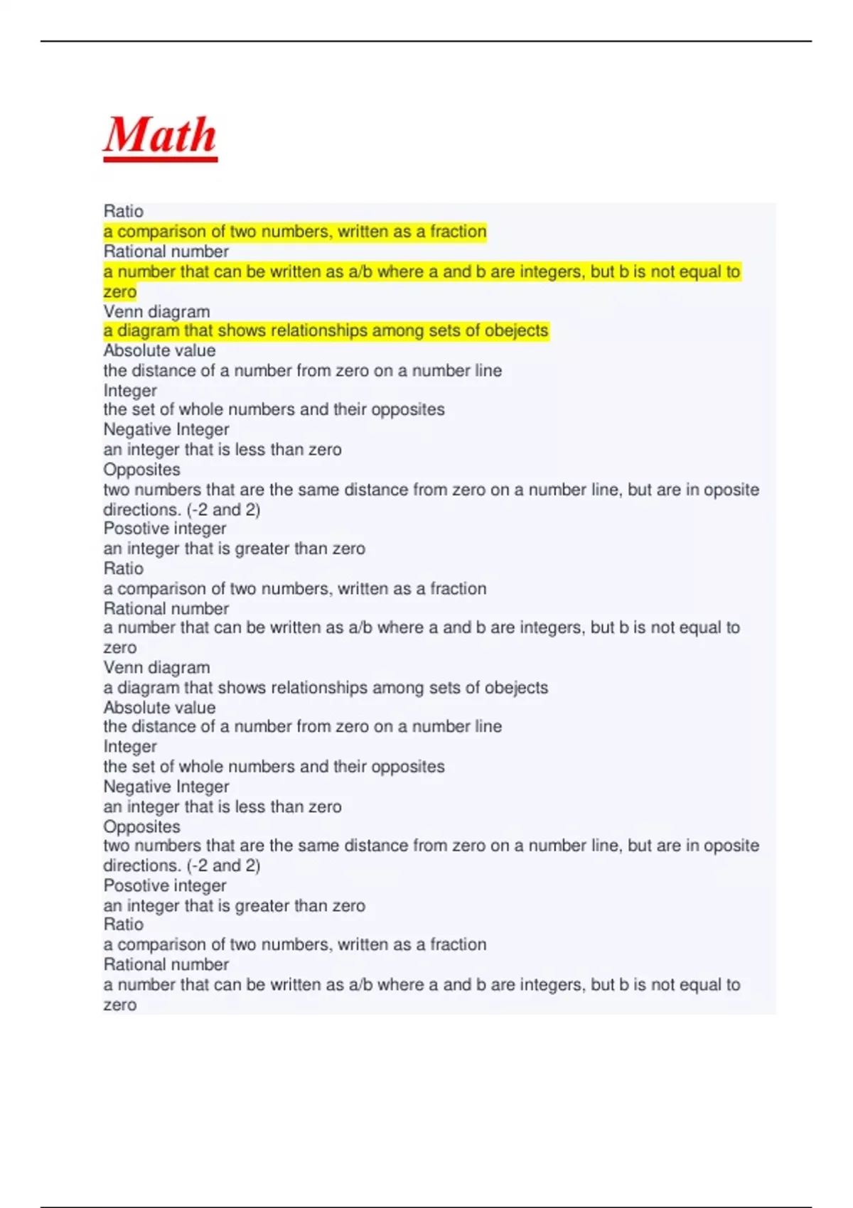 Venn diagram a diagram that shows relationships among sets of obejects Absolute value the distance of a number from zero on a number line Integer the set of whole numbers and their opposites Negative Integer an integer that is less than zero Opposites two numbers that are the same distance from zero on a number line, but are in oposite directions. (-2 and 2) Posotive integer an integer that is greater than zero vRatio a comparison of two numbers, written as a fraction Rational number a number that can be written as a/b where a and b are integers, but b is not equal to zero Venn diagram a diagram that shows relationships among sets of obejects Absolute value the distance of a number from zero on a number line Integer the set of whole numbers and their opposites Negative Integer an integer that is less than zero Opposites
