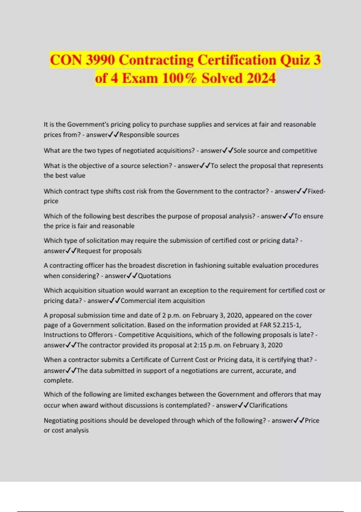 ntracting Certification Quiz 3 of 4 Exam 100% Solved 2024 It is the Government's pricing policy to purchase supplies and services at fair and reasonable prices from? - answerResponsible sources What are the two types of negotiated acquisitions? - answerSole source and competitive What is the objective of a source selection? - answerTo select the proposal that represents the best value Which contract type shifts cost risk from the Government to the contractor? - answerFixed- price Which of the following best describes the purpose of proposal analysis? - answerTo ensure the price is fair and reasonable Which type of solicitation may require the submission of certified cost or pricing data? - answerRequest for proposals A contracting officer has the broadest discretion in fashioning suitable evaluation procedures when considering? - answerQuotations Which acquisition situation would warrant an exception to the requirement for certified cost or pricing data? - answerCommercial item acquisition A proposal submission time and date of 2 p.m. on February 3, 2020, appeared on the cover page of a Government solicitation. Based on the information provided at FAR 52.215-1, Instructions to Offerors - Competitive Acquisitions, which of the following proposals is late? - answerThe contractor provided its proposal at 2:15 p.m. on February 3, 2020 When a contractor submits a Certificate of Current Cost or Pricing data, it is certifying that? - answerThe data submitted in support of a negotiations are current, accurate, and complete. Which of the following are limited exchanges between the Government and offerors that may occur when award without discussions is contemplated? - answerClarifications Negotiating positions should be developed through which of the following? - answerPrice or cost analysis